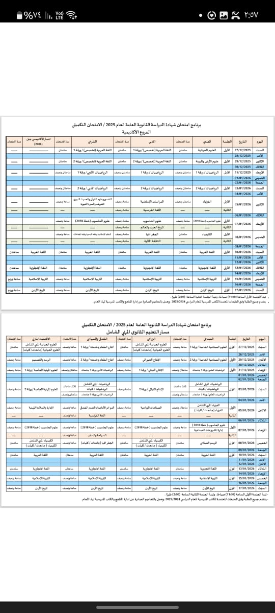 ويبدأ أول أيام الامتحانات يوم السبت الموافق 27 كانون الأول 2025، وتُختتم يوم السبت الموافق 17 كانون الثاني 2026.