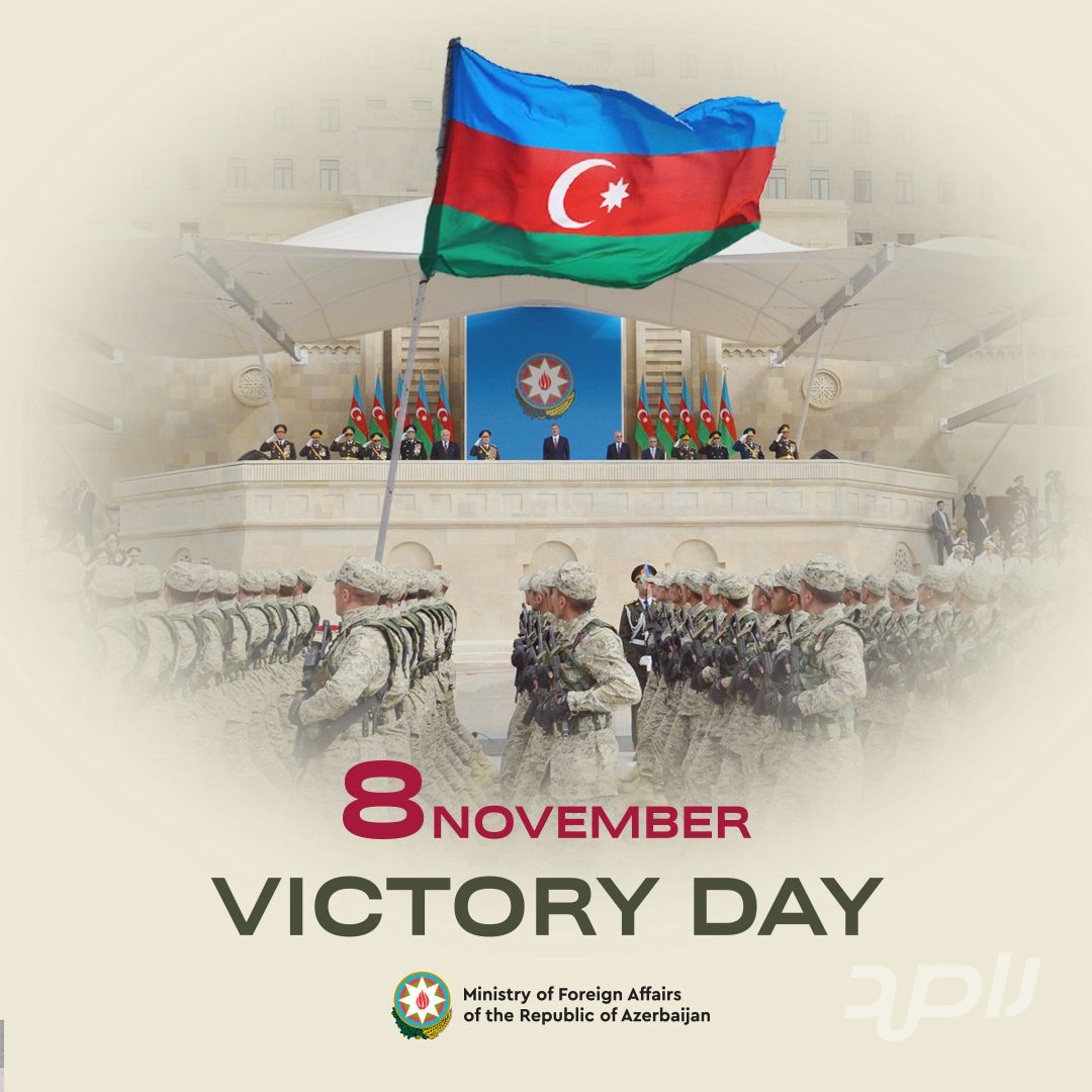أعلن الرئيس الهام علييف رئيس جمهورية أذربيجان بأن يوم 8 نوفمبر "يوم النصر في الحرب الوطنية الأذربيجانية/2020، و دون هذا التاريخ من بدء دخول القوات الأذربيجانية إلى مدينة شوشة العاصمة الثقافية بعد تحريرها ، اليوم الذي استعادت فيه أذربيجان وحدة أراضيها وأذهلت الكثيرين بانتصارها العسكري ، و قد نفذت بنفسها قرارات مجلس الأمن الأربعة التي دعت فيها إلى انسحاب فوري وغير مشروط وكامل لجميع قوات الاحتلال من أراضي أذربيجان المعترف بها دوليًا ، والتي ظلت حبرا على ورق لمدة 30 عاما، ولمدة 44 يوما كان عشرة ملايين قلب في أذربيجان ينبضون كقلب واحد وبنفس التناغم للجنود الابطال المقاتلين من أجل تحرير قراباغ، و يتشوقون للنصر لإحياء الأرض التي دمرها العدو ، وقد تم تحرير اكثر من 300 منطقة سكنية في ميدان المعركة. وأُرغمت ارمينيا على توقيع وثيقة الاستسلام.