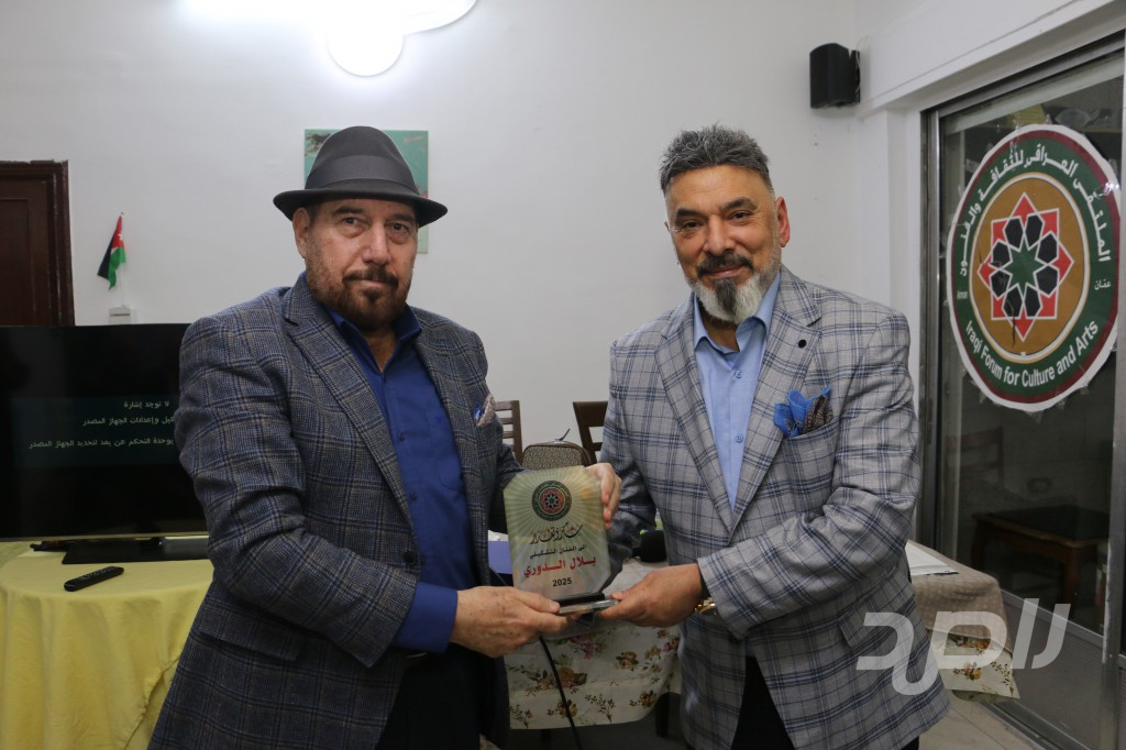 استضاف الملتقى العراقي للثقافة والفنون في الاردن مساء اليوم الاحد 16/تشرين الثاني/نوفمبر/2025 م في قاعة بيت الثقافة والفنون بعمان وضمن نشاطاته المتعددة والمتنوعة الفنان التشكيلي العراقي المعروف بلال الدوري في أمسية ثقافية فنية تشكيلية ادارها الاعلامي العراقي الدكتور مجيد السامرائي بعنوان (الواقعية في أعمال الفنان التشكيلي العراقي بلال الدوري) في امسية حوارية حول تجربته الفنية واعماله بحضور رئيس الملتقى الصحفي والباحث الفنان ضياء الراوي وعدد من اعضاء الملتقى واصدقائه بالاضافة الى عدد من الكتاب والادباء والاكاديميين والفنانين والمهتمين وفي ختام الامسية قام الراوي بتكريم الفنان الدوري بدرع الملتقى .