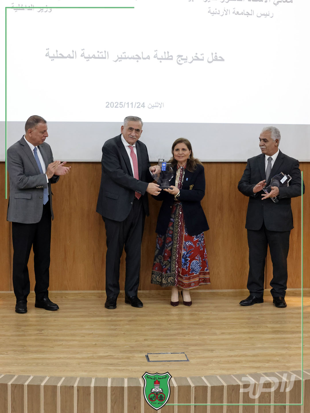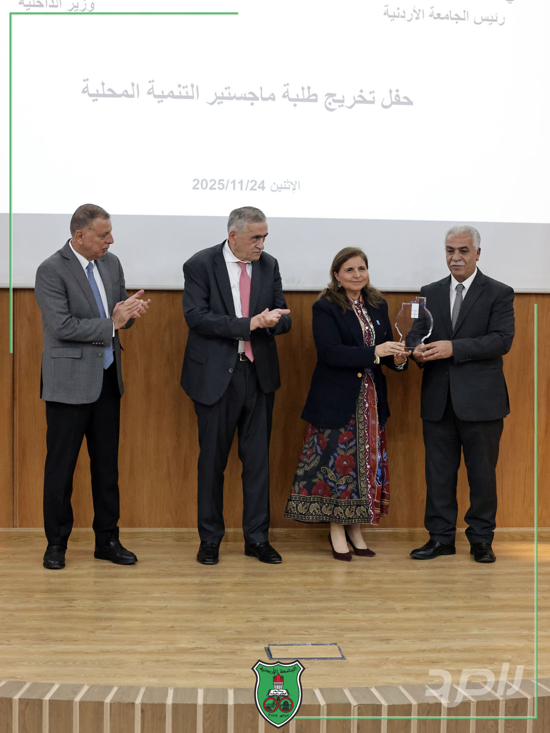 وفي ختام الحفل، سلّم وزيرُ الداخلية ورئيس الجامعة الشّهادات لاثنين وثمانينَ خريجًا وخريجةً، في أول دفعة من الماجستير في التّنمية المحليّة، وسْطَ حضور رسميّ وأكاديميّ، وأكّدت الجامعةُ الأردنيّة أنّ هذا البرنامج يشكّل نموذجًا للتّعاون بين مؤسّسات الدولة والشركاء الدّوليين، وإسهامًا حيويًّا في رفد مسارات التّنمية المحليّة بكفاءات مؤهّلة قادرة على دعم مسيرة الإصلاح الإداريّ في المملكة.