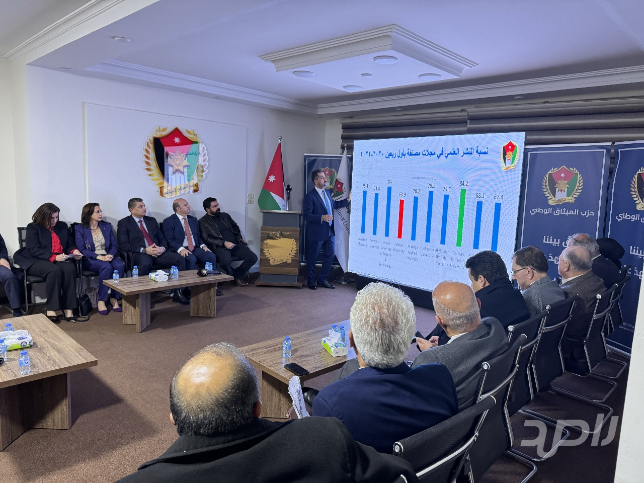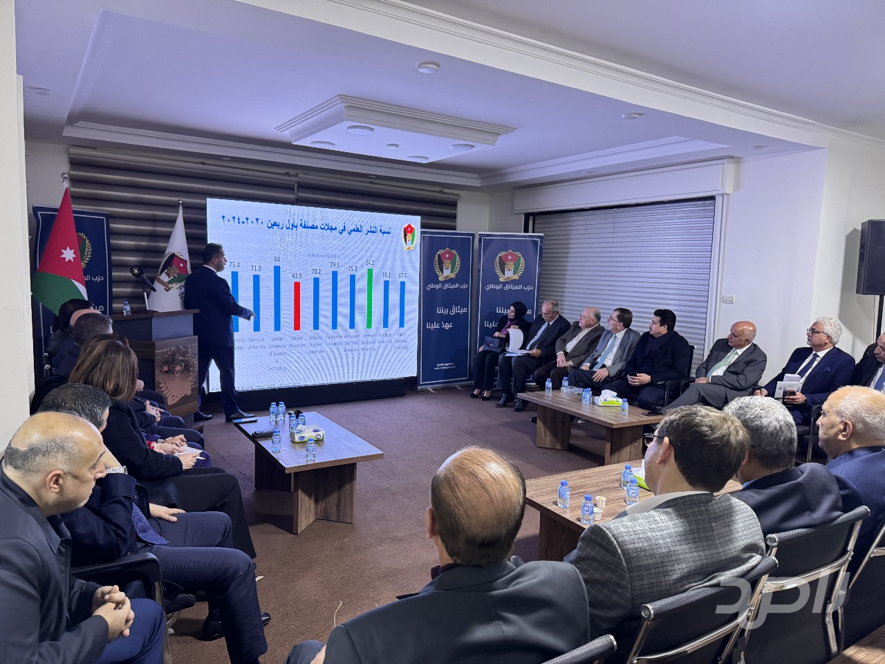 عقدت اللجنة التنفيذية للتعليم العالي والبحث العلمي في حزب الميثاق الوطني جلسة نقاشية بعنوان: "جودة.. بحث.. شراكات: مفاتيح تحسين تنافسية الجامعات الأردنية إقليمياً وعالمياً”، بحضور الامين العام بالوكالة وأعضاء من المكتب السياسي والمجلس المركزي ونواب من كتلة الميثاق و بمشاركة نخبة من الوزراء السابقين ورؤساء الجامعات السابقين وعدد من الأكاديميين والخبراء البارزين، وذلك في مقر الحزب في عمّان.