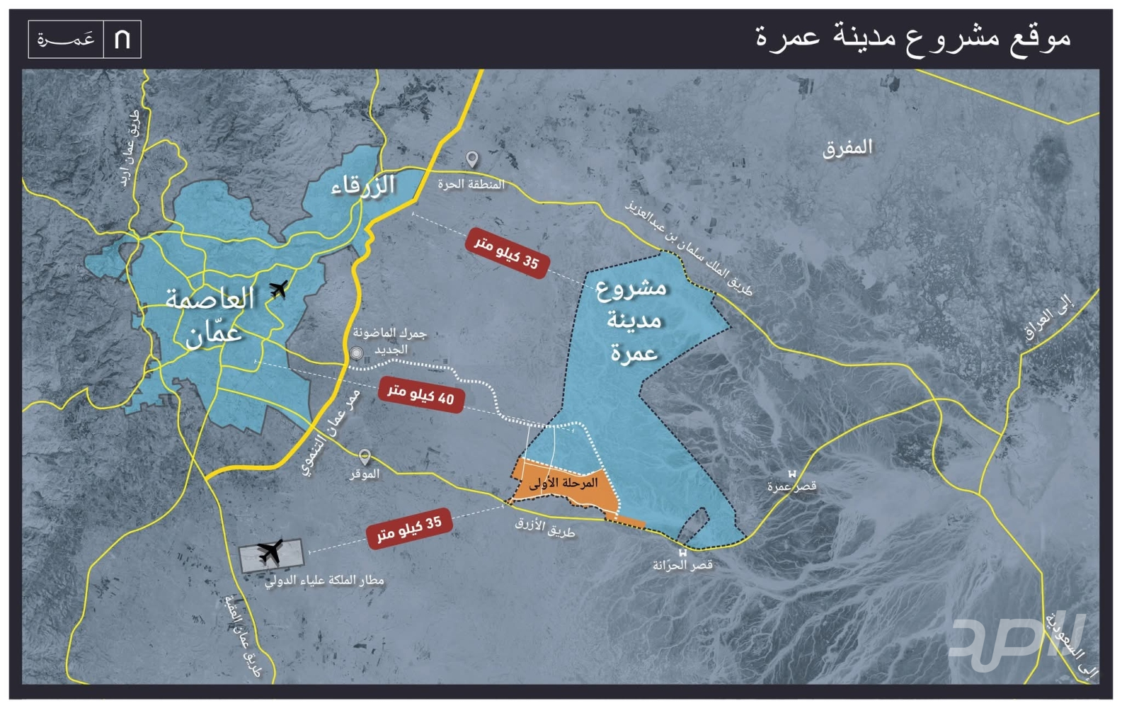 رئيس الوزراء يطَّلع على مخطَّطات المشاريع التي ستنشأ خلال المرحلة الأولى في مشروع مدينة عمرة والتي ستُقام على مساحة 40 ألف دونم من أصل نصف مليون دونم، وستتولَّى الشَّركة الأردنيَّة لتطوير المدن والمرافق الحكوميَّة متابعة وتسهيل مراحل إنجازها، وسيبدأ العمل فيها مطلع العام المقبل وتمتدُّ حتى عام 2029م وسينجز بعضها خلال عامين.
