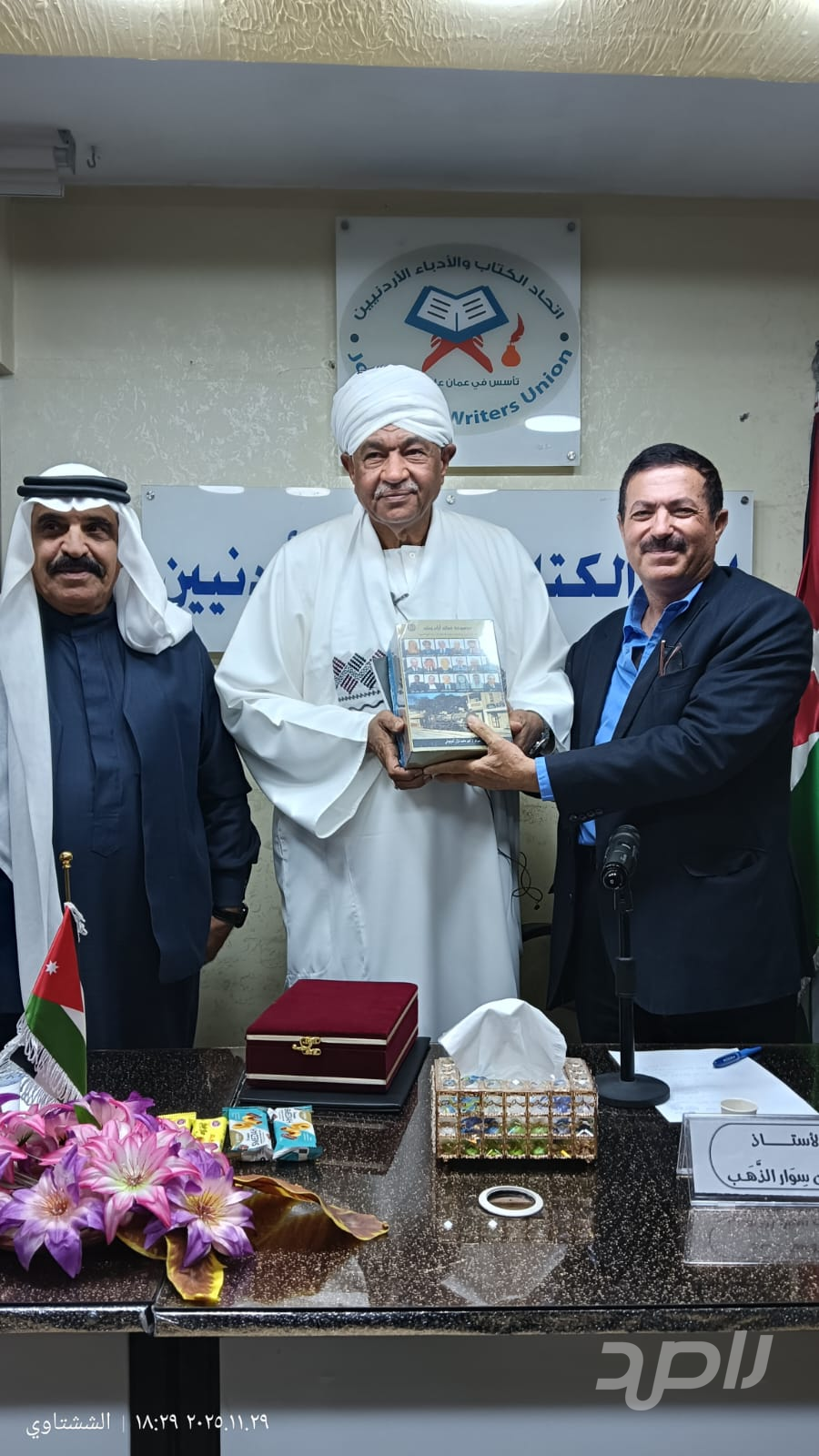 فالذاكرة تتعرّض للمحو… والروح تُستنزف… لكن الثقافة السودانية تظل واقفة ترفع رأسها في وجه الحرب وتُعلن أنّها آخر ما سيُهزم. وفي نهاية المحاضرة أجاب سعادة السفير السوداني على كافة أسئلة ومداخلات الحضور ، قدم وقدم الاستاذ عمر العرموطي موسوعة عمان. والدكتور محمد النجار مجموعة من نتاجه الثقافي وتشرفة رئيس اتحاد الكتاب والأدباء الاردنيين الشاعر عليان العدوان بتقديم شهادة تكريمية لسعادة السفير حسن سوار الذهب تقديرا لجهوده في خدمة الثقافة ، كما تم التقاط الصور التذكارية، لهذه المحاضرة القيمة .