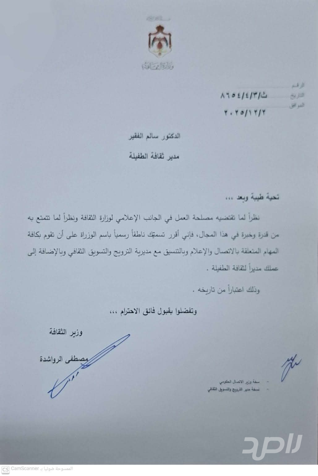 الاربعاء - 3 كانون أول 2025 - يتقدم محمد الحجايا رئيس جمعية البادية الأردنية للفكر والثقافة والتنمية، والزملاء أعضاء الهيئة الإدارية والعامة للجمعية، بأصدق عبارات التهنئة والتبريك للأخ العزيز عطوفة سالم الفقير مدير ثقافة محافظة الطفيلة.