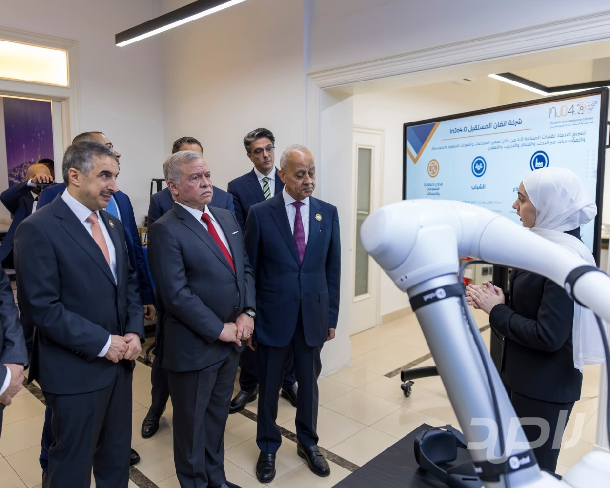 وزار جلالته مركز الابتكار الأردني للثورة الصناعية الرابعة (InJo4.0) في مقر غرفة الصناعة، واستمع إلى شرح من المهندسة دانا قدع عن أهداف المركز الذي يسعى إلى تسريع تبني الحلول الرقمية والتكنولوجية المتقدمة في القطاع الصناعي، لرفع الإنتاجية وتعزيز التنافسية العالمية.