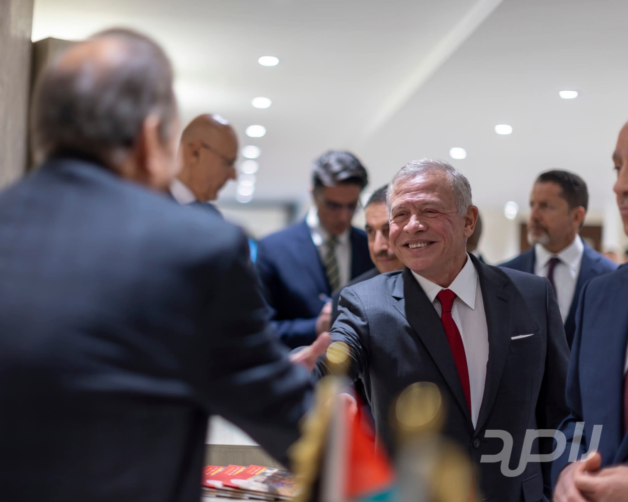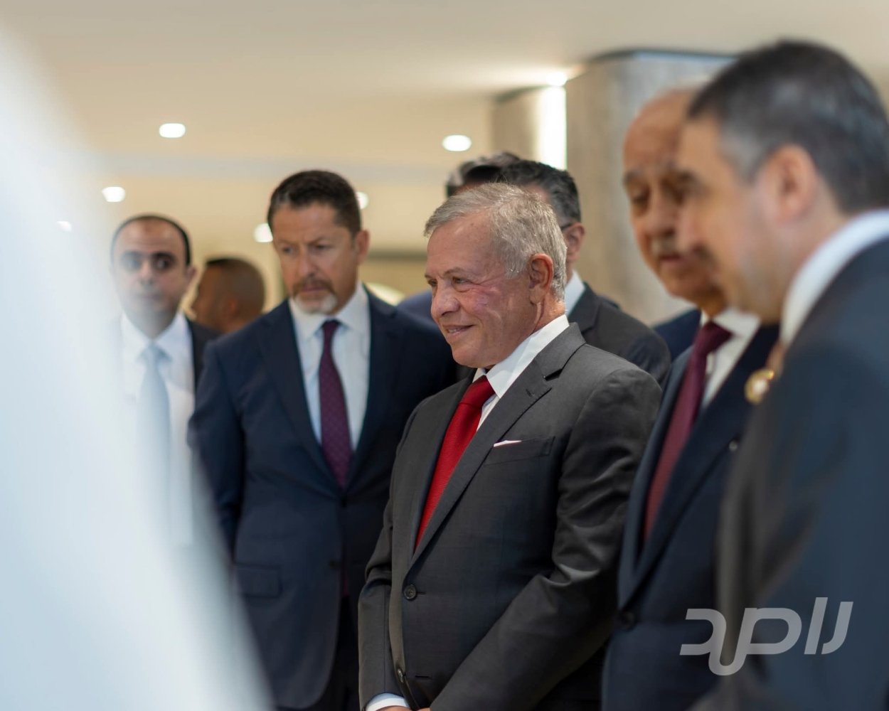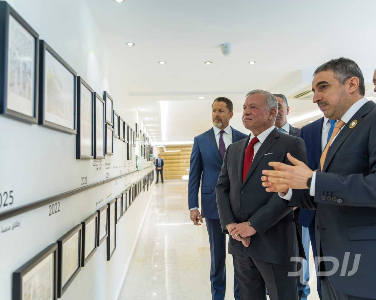 ولدى وصول جلالة الملك إلى مقر الغرفة، اطلع على جدارية خاصة تستعرض مسيرة الصناعة الأردنية، واستمع إلى شرح قدمه مدير الغرفة الدكتور نائل الحسامي عن أبرز محطات تطور هذا القطاع الحيوي.