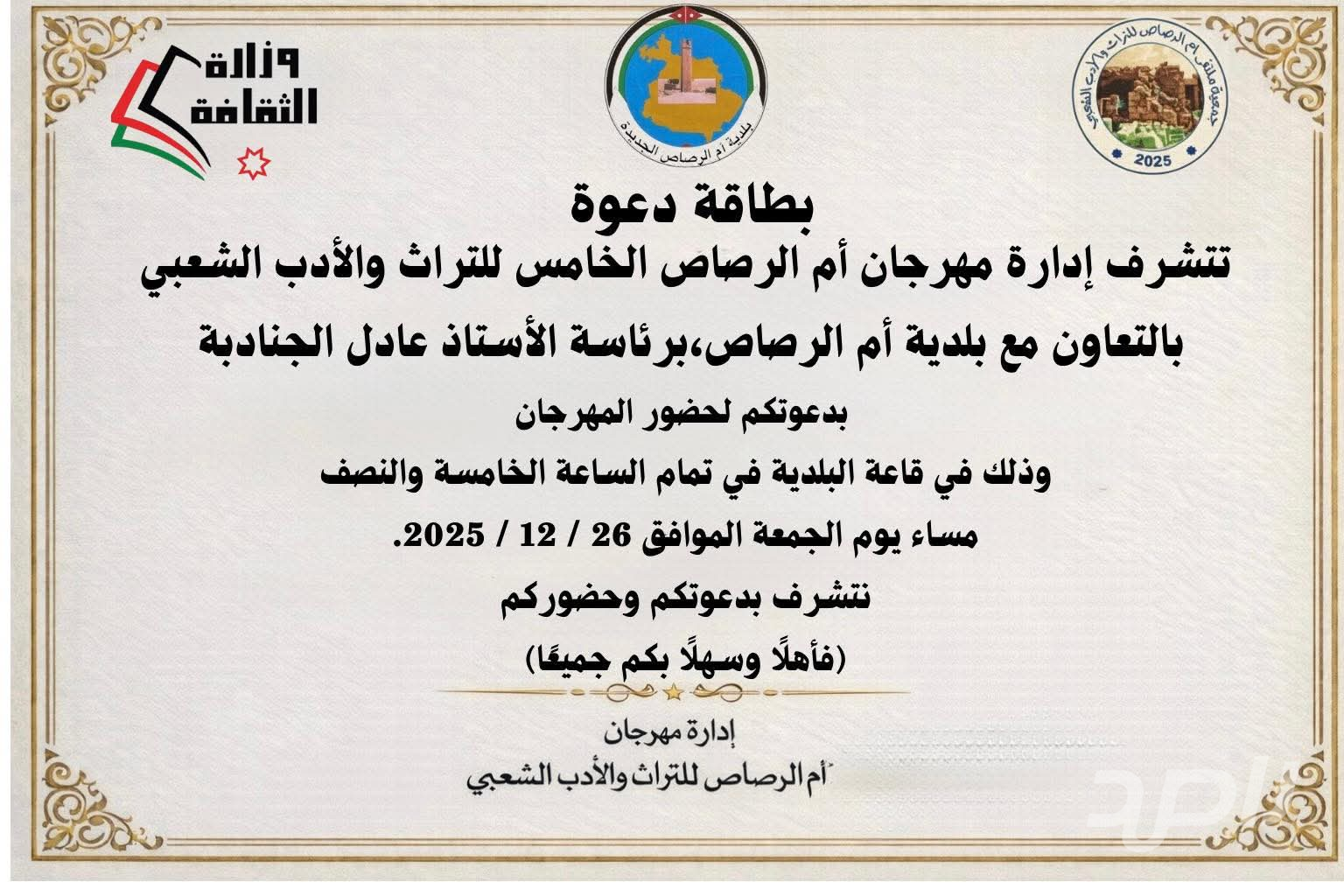 تُعلن إدارة مهرجان أم الرصاص الخامس للتراث والأدب الشعبي، بالتعاون مع بلدية أم الرصاص التي يرأسها الأستاذ عادل الجنادبة، عن استعدادها لإطلاق فعاليات الدورة الخامسة من هذا المهرجان الثقافي المهم، والذي يُعدُّ أحد أبرز الفعاليات التراثية في المنطقة.