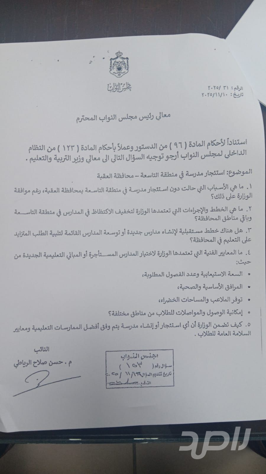 عمان 29 كانون الأول 2025 – وجه النائب الدكتور حسن الرياضي سؤالاً نيابياً حاداً إلى معالي وزير التربية والتعليم، يتعلق بملف استئجار مبنى مدرسة في المنطقة التاسعة بمحافظة العقبة، معرباً عن اعتقاده بأن الإجابة الرسمية السابقة للوزارة حول الموضوع تضمنت معلومات "تخالف الواقع" وداعياً إلى فتح تحقيق عاجل.