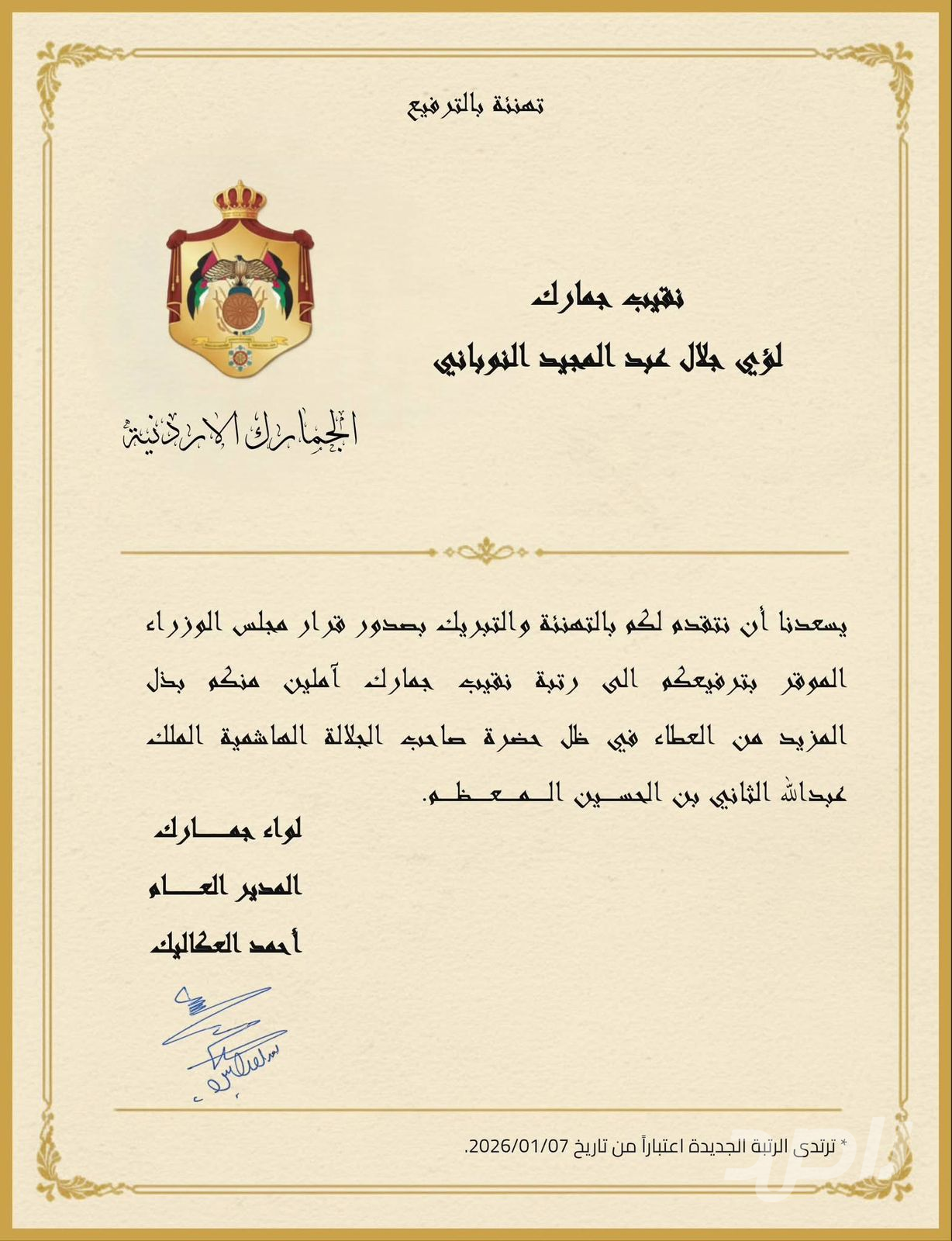 تهنئة لنقيب الجمارك لؤي جلال النوباني