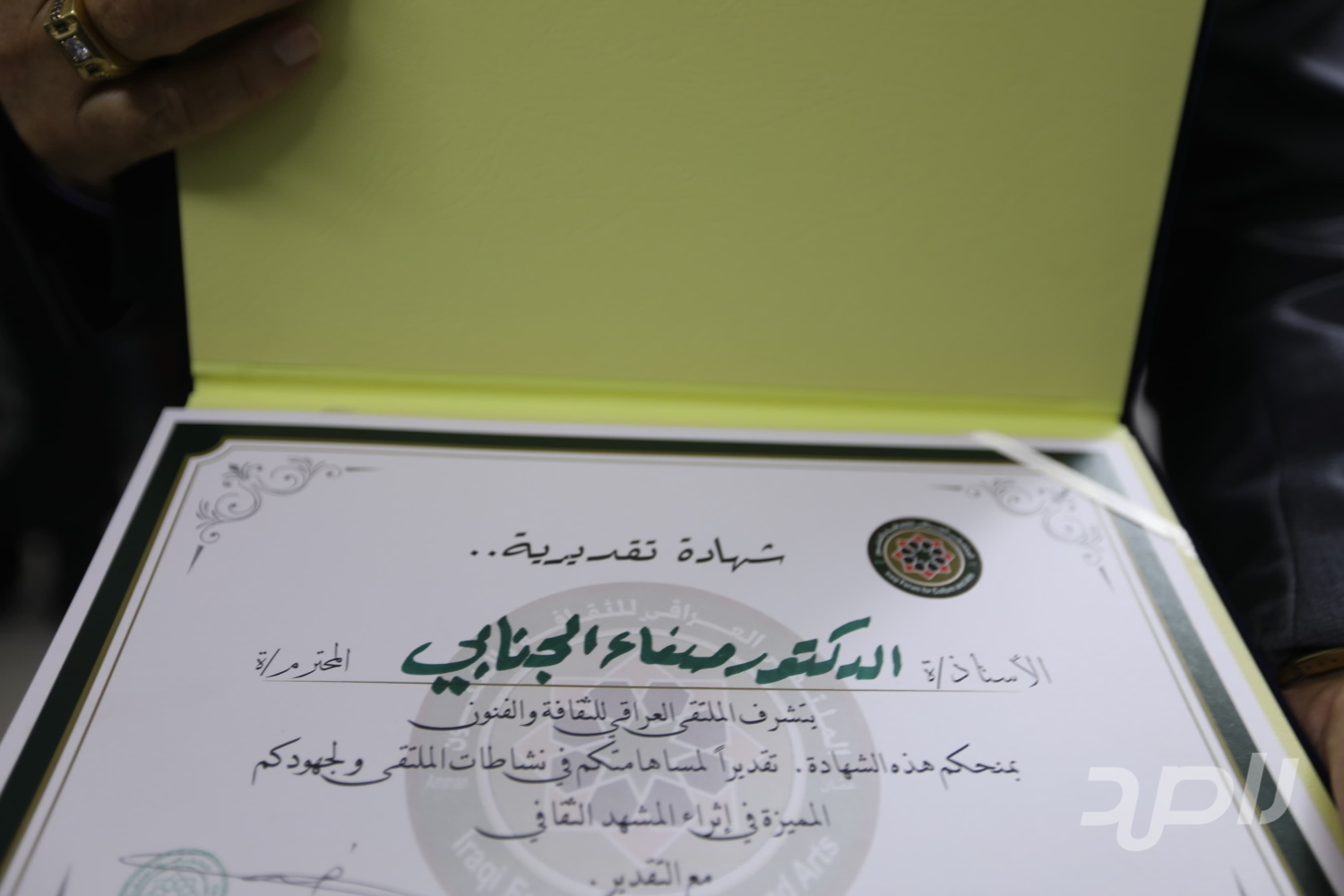 كما شمل الحفل تكريماً خاصاً قدّمه الدكتور صفاء الجنابي، رئيس هيئة المستشارين في الاتحاد العربي للإعلام الإلكتروني / العراق، في لفتة لاقت استحسان الحضور وعكست عمق التعاون الثقافي والإعلامي المشترك بين المؤسسات المعنية بالشأن العراقي.