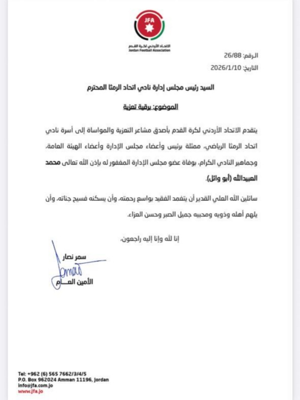 ويُعد الفقيد من الإداريين الذين ارتبط اسمهم بنادي اتحاد الرمثا، حيث شكّل جزءًا أساسيًا من منظومته الإدارية، وعايش مختلف مراحل النادي، من فترات الاستقرار والإنجاز، إلى التحديات والظروف الصعبة، محافظًا في جميعها على حضوره والتزامه المهني.