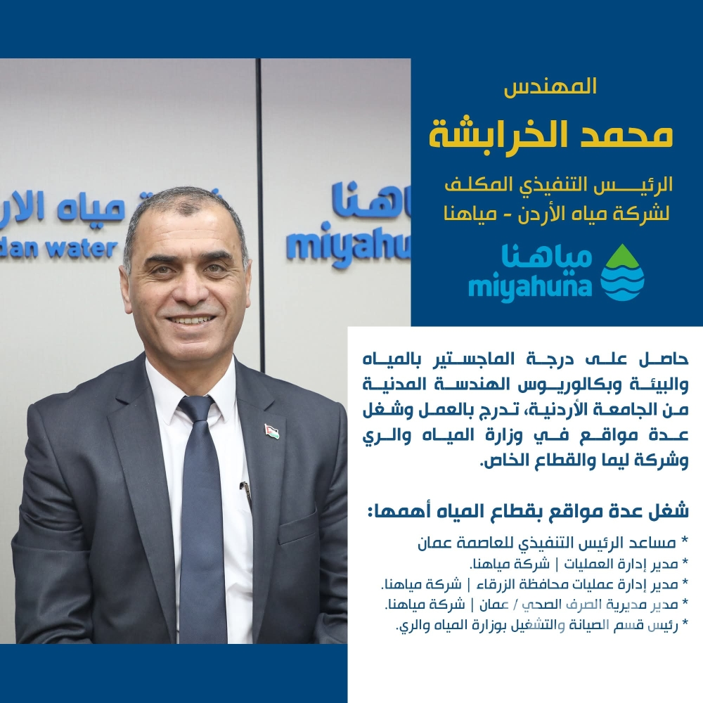 وبالتوازي مع هذا القرار، أصدر قرار بتعيين المهندس محمد الخرابشة قائماً بأعمال الرئيس التنفيذي لشركة مياهنا، وذلك لمدة ثلاثة أشهر قابلة للتجديد. وتم تكليف المهندس الخرابشة بمهام الإشراف المباشر على سير العمل اليومي في جميع أقسام الشركة وفروعها، والعمل على ضمان تحقيق الأهداف التشغيلية والاستراتيجية المحددة، مع التركيز على تحسين مستوى الخدمة المقدمة للمشتركين وضمان استدامة المصادر المائية.