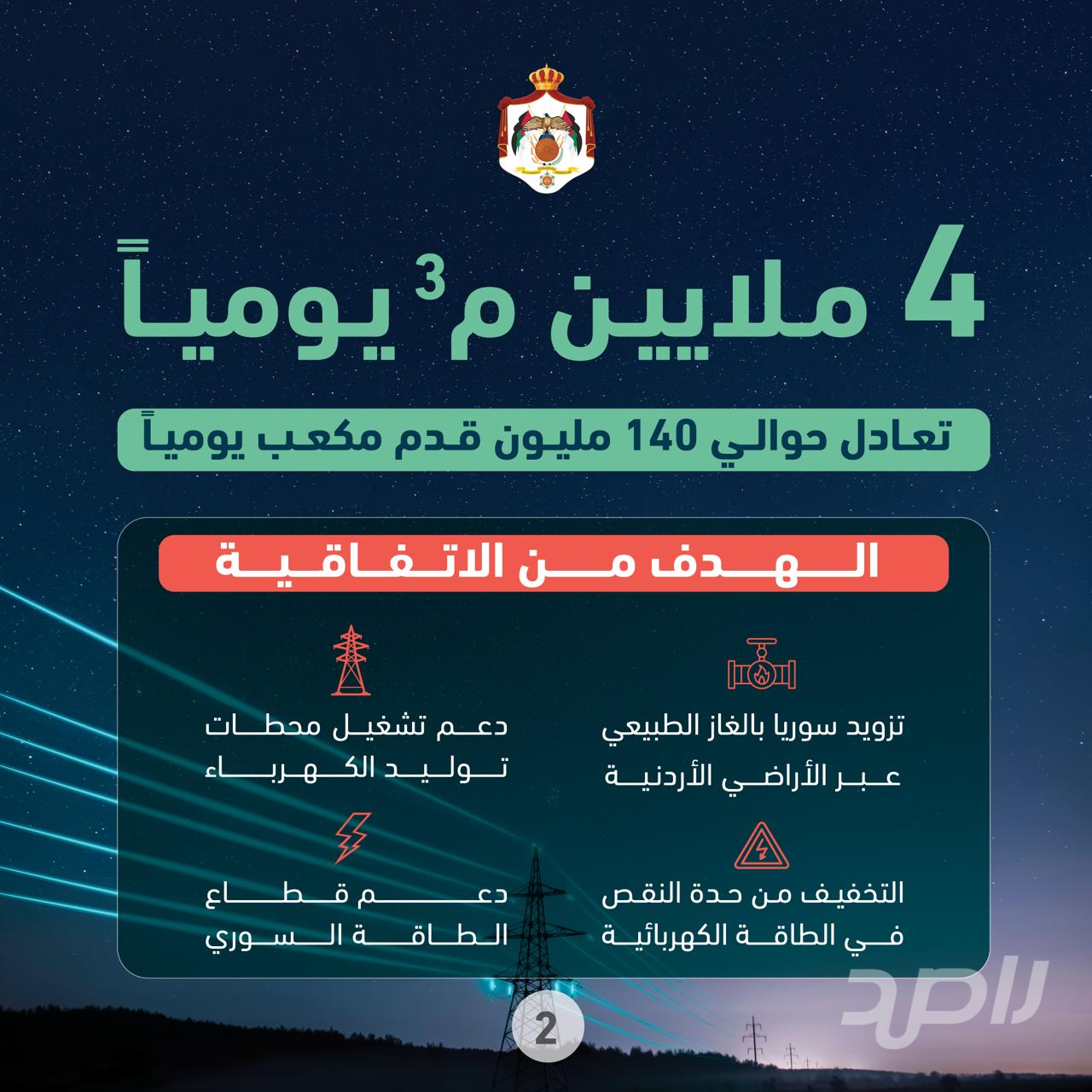 وأكد الخرابشة أن الاتفاقية تنص على قيام الأردن بتزويد الجانب السوري بنحو (4) ملايين متر مكعب من الغاز الطبيعي يومياً، أي ما يعادل حوالي (140) مليون قدم مكعب، مشيراً إلى أن هذه الكميات ستسهم بشكل مباشر في تحسين استقرار منظومة الكهرباء في سوريا ودعم تشغيل محطات التوليد.