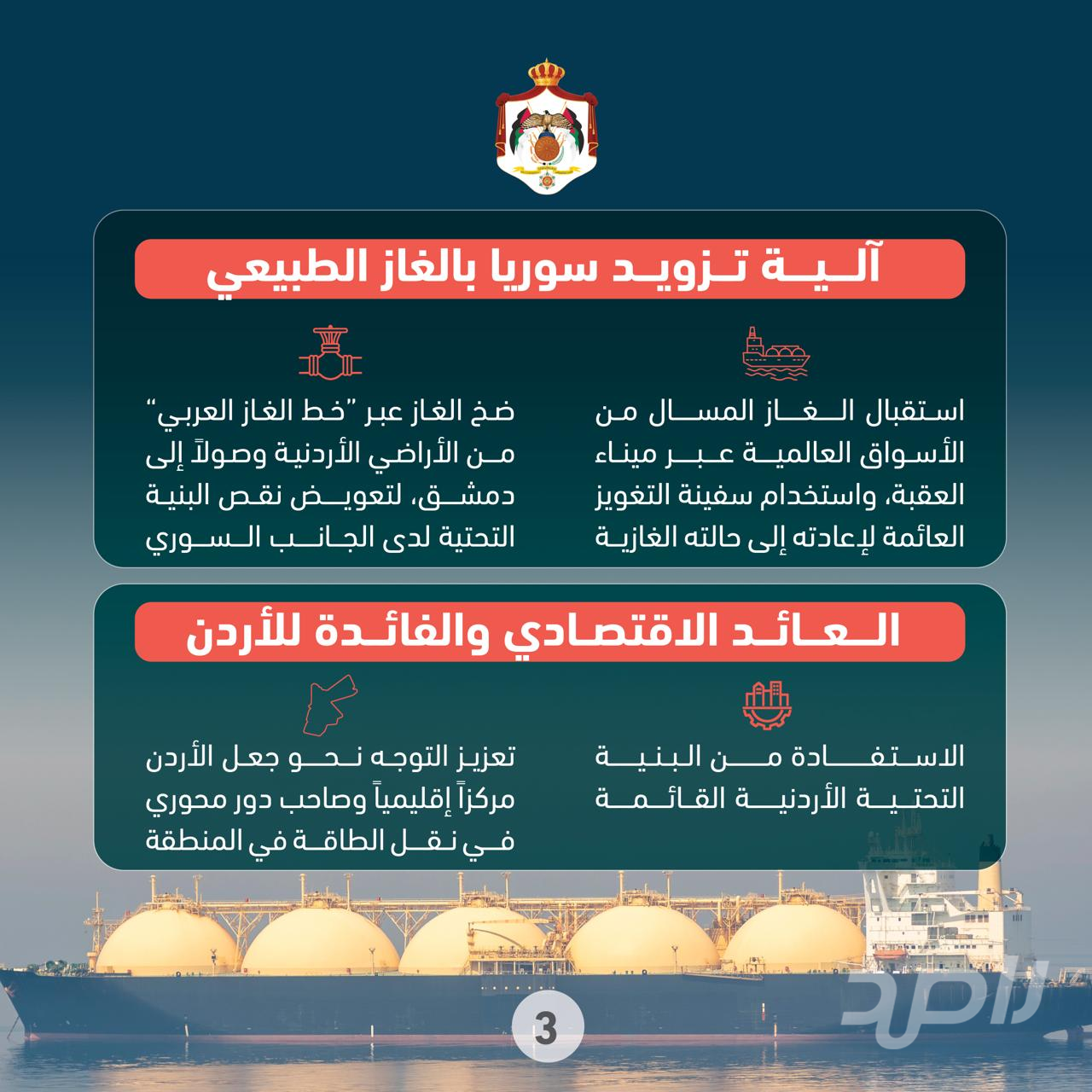 وبيّن الخرابشة أن المشروع يعتمد على البنية التحتية المتطورة التي يمتلكها الأردن، حيث يتم استخدام سفينة التغويز العائمة في ميناء العقبة لاستقبال الغاز الطبيعي المسال المستورد من الأسواق العالمية، وإعادة تحويله إلى حالته الغازية، ثم ضخه عبر خط الغاز العربي باتجاه الأراضي السورية وصولاً إلى دمشق، في ظل عدم جاهزية البنية التحتية اللازمة لدى الجانب السوري.