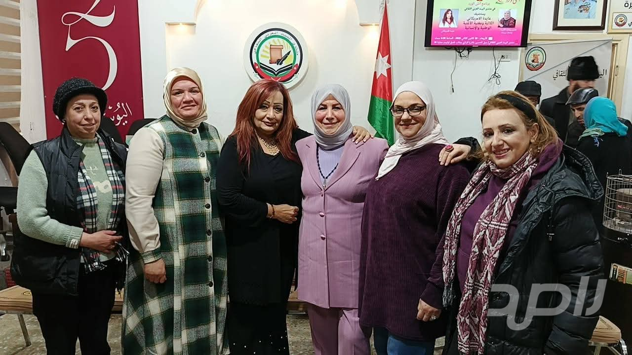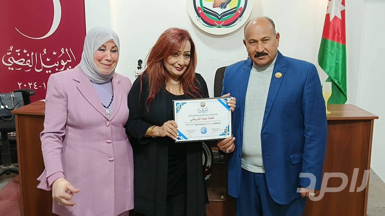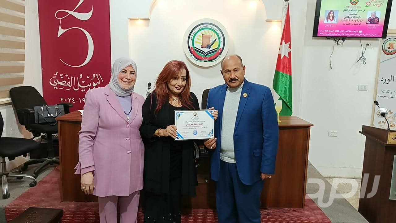 وفي ختام الفعالية، قام رئيس منتدى البيت العربي الثقافي الأستاذ صالح الجعافرة بتكريم الفنانة عايدة الأمريكاني بمنحها شهادة شكر وتقدير، تثمينًا لعطائها الفني والأدبي، وإسهاماتها المتميزة في إثراء الحركة الثقافية والفنية، وسط إشادة واسعة من الحضور بمسيرتها الحافلة وإنجازاتها الإبداعية.