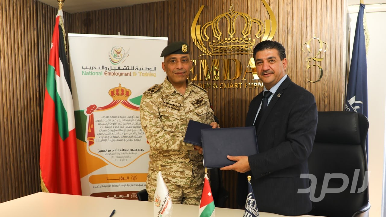 ووقّع الاتفاقية عن الشركة الوطنية للتشغيل والتدريب مديرها العام العميد الركن أشرف عليمات، فيما وقّعها عن شركة إمداد لصناعة الأثاث والأثاث الذكي الرئيس التنفيذي السيد سلطان المعايطة.