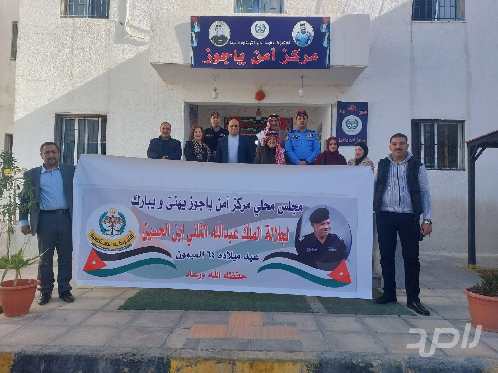 نفذ أعضاء المجلس المحلي لمركز أمن ياجوز وأعضاء المجلس المحلي لمركز امن الشرق فعالية احتفالية بمناسبة عيد ميلاد جلاله الملك عبدالله الثاني ابن الحسين المعظم ، تضمنت تعليق اليافطات وتوزيع الحلوى على المواطنين، بحضور رؤساء المراكز الأمنية والشرطة المجتمعية بالرصيفة والزرقاء.