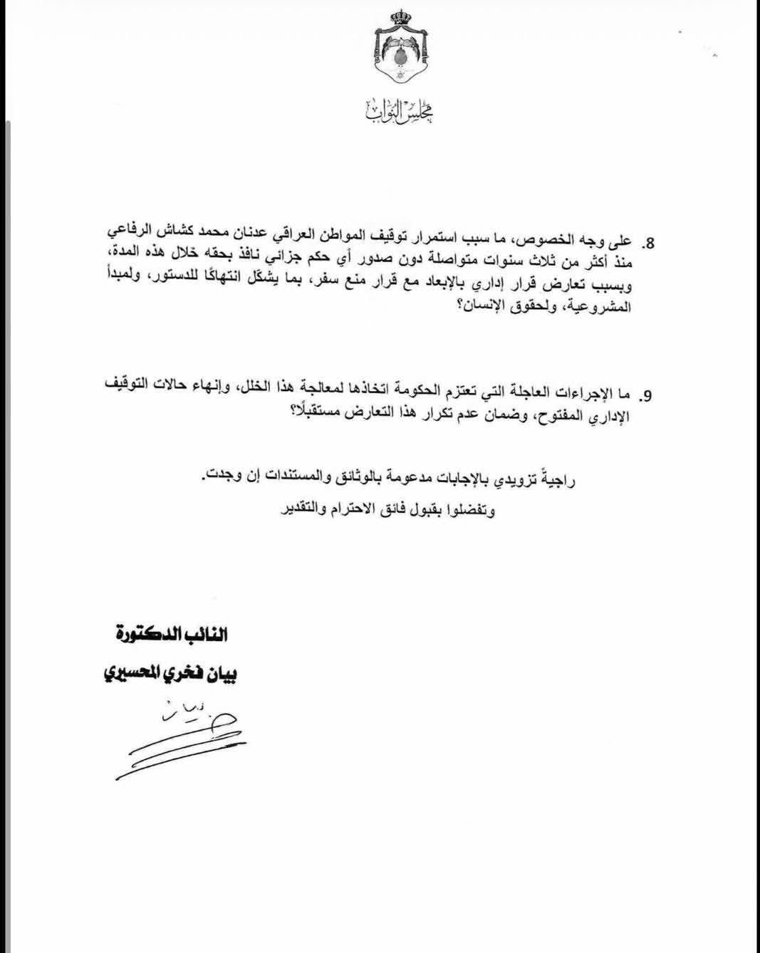 وقدمت النائب حالة محددة كمثال صارخ، هي حالة المواطن العراقي عدنان محمد كشاش الرفاعي، الذي يمضي في التوقيف الإداري منذ أكثر من ثلاث سنوات دون صدور حكم قضائي نهائي بحقه، بسبب التعارض بين قرار إبعاده وقرار منع سفره، معتبرة أن وضعه يمثل انتهاكاً واضحاً للدستور ومبادئ العدالة.
