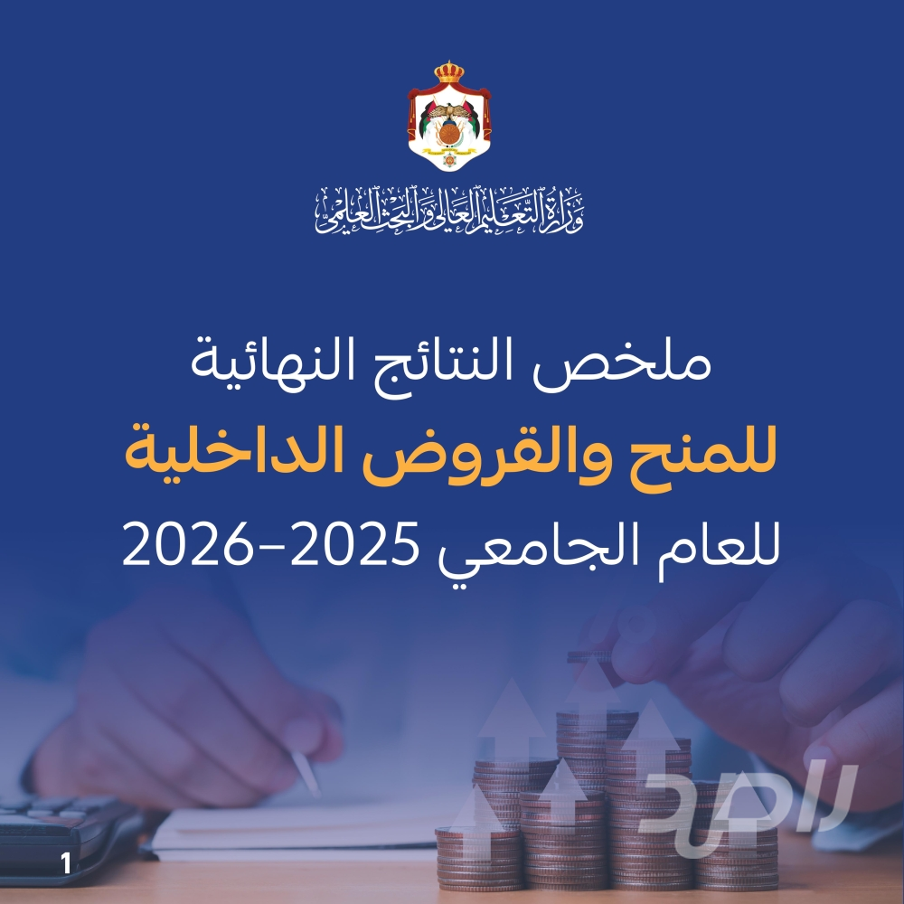 تعلن وزارة التعليم العالي والبحث العلمي، مساء اليوم الأحد الموافق 8-2-2026 القوائم النهائية لأسماء الطلبة المرشحين للاستفادة من المنح والقروض الداخلية للطلبة الدارسين ضمن البرنامج العادي في الجامعات والكليات الأردنية الرسمية لمستويي البكالوريوس والدبلوم المتوسط للعام الجامعي الحالي 2025-2026، حيث ستقوم الوزارة بإرسال رسائل نصية بنتائج الترشيح للطلبة على أرقام الهواتف الخلوية المخزنة في طلباتهم، ثم سيتم فتح الموقع الإلكتروني لمديرية البعثات بحيث يتمكن الطلبة من الإطلاع على النتائج المعلنة بكل شفافية.