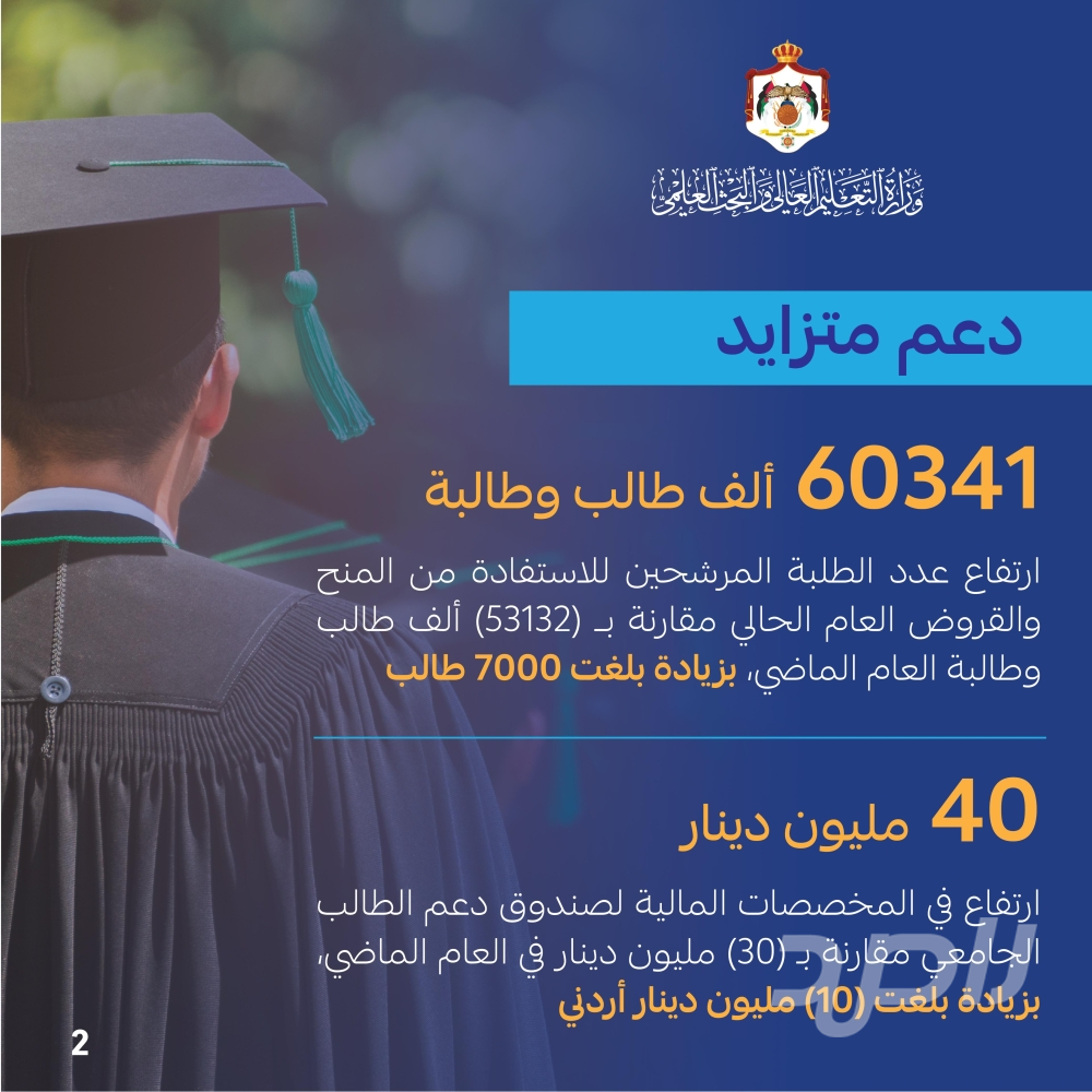 •ارتفاع المخصصات المالية لصندوق دعم الطالب الجامعي من (30) مليون دينار في العام الماضي إلى (40) مليون دينار في العام الحالي وبزيادة بلغت (10) مليون دينار أردني.
