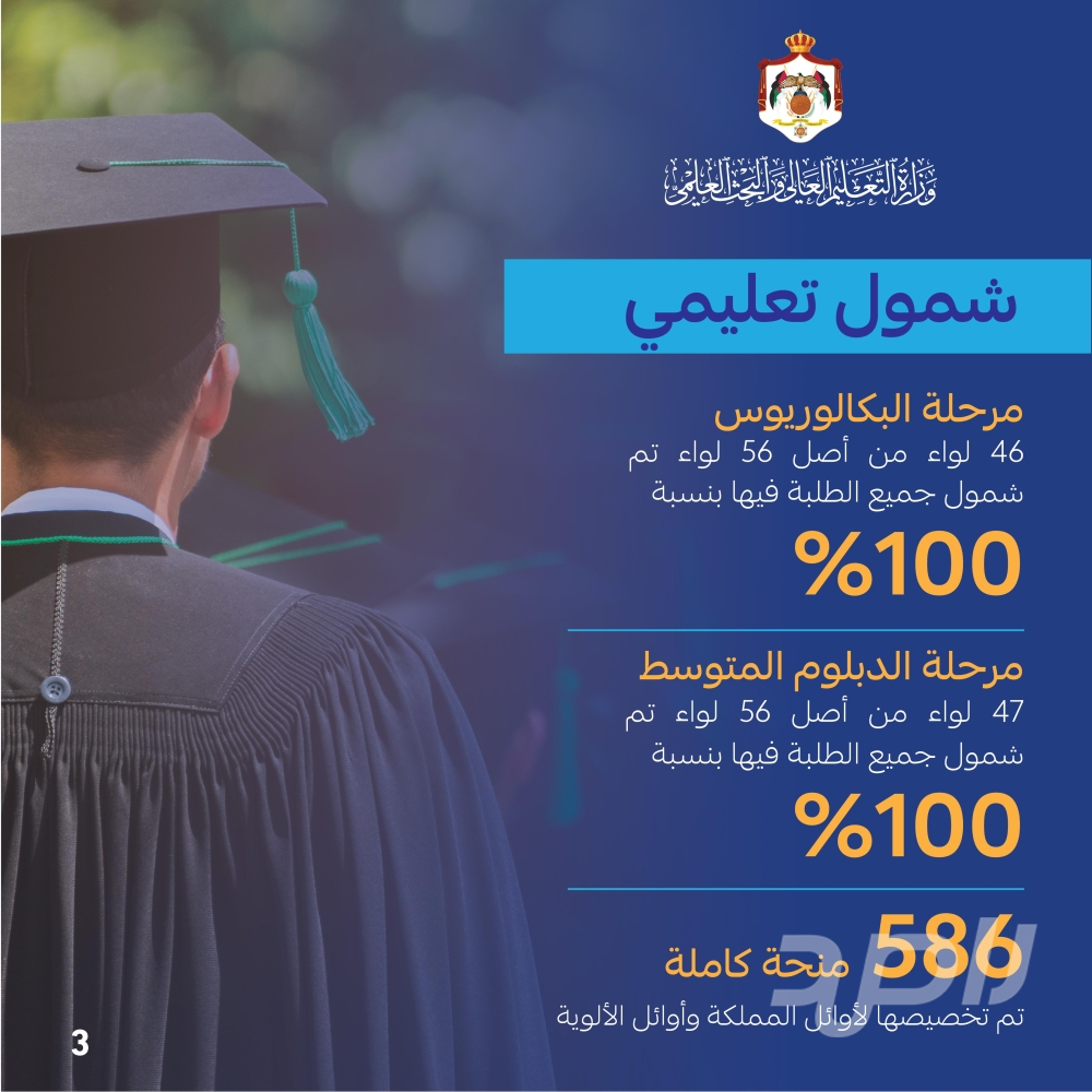 وأضافت الوزارة بأن(47) لواء من أصل (56) لواء من ألوية المملكة تم شمول جميع الطلبة فيها في درجة الدبلوم المتوسط بالمنح والقروض بنسبة (100)% ، في حين أن (46) لواء من أصل (56) لواء من ألوية المملكة تم شمول جميع الطلبة فيها في درجة البكالوريوس بالمنح والقروض بنسبة (100)%.