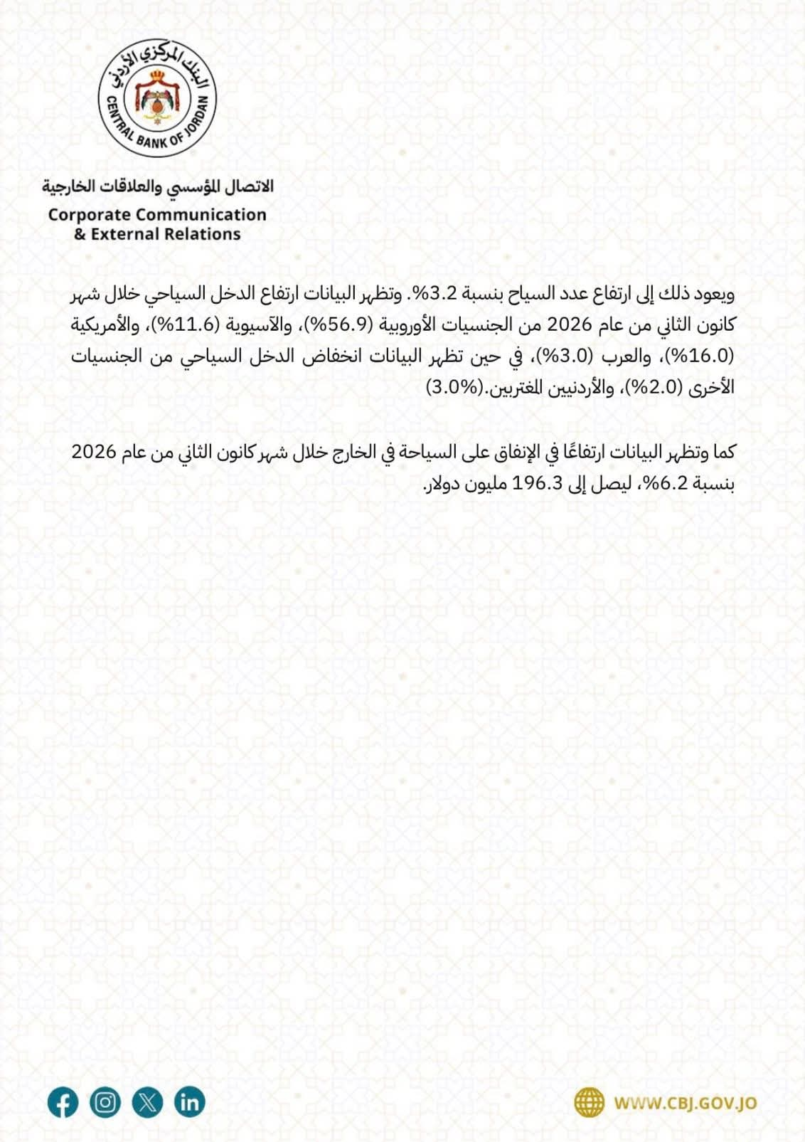 على صعيد آخر، كشفت البيانات الصادرة عن البنك المركزي عن ارتفاع ملحوظ في الدخل السياحي للمملكة خلال شهر كانون الثاني من عام 2026، حيث سجل زيادة نسبتها 4.1% ليصل إلى 708.5 مليون دولار أمريكي، مقارنة مع الفترة ذاتها من العام الماضي التي كان قد سجل فيها ارتفاعاً بنسبة 22.8% وبلغ 680.5 مليون دولار. ويعود هذا النمو المستمر في الإيرادات السياحية بشكل رئيسي إلى ارتفاع أعداد السياح القادمين إلى المملكة بنسبة 3.2% خلال نفس الشهر، مما يؤكد استمرار تعافي القطاع السياحي وقدرته على جذب الزوار من مختلف أنحاء العالم، رغم التحديات الإقليمية والدولية.
