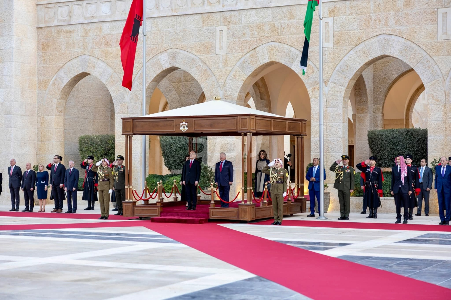 وحضر المباحثات نائب رئيس الوزراء ووزير الخارجية وشؤون المغتربين أيمن الصفدي، ومدير مكتب جلالة الملك، المهندس علاء البطاينة، ووزير الصحة الدكتور إبراهيم البدور، رئيس بعثة الشرف المرافقة للضيف، والسفير الأردني غير المقيم في ألبانيا زهير النسور، والسفير الألباني لدى الأردن سامي شيبا.