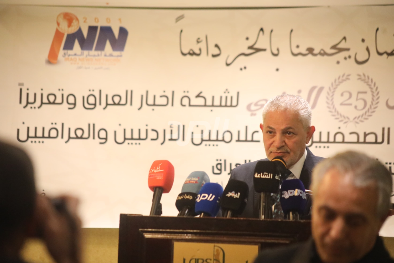 وفي كلمة له خلال الحفل، رحب مندوب وزير الاتصال الحكومي الدكتور زيد النوايسة بالحضور الكرام، معبراً عن سعادته بهذا التجمع الإعلامي الأردني العراقي الأخوي. ودعا الوزير في كلمته لمزيد من التقدم والازدهار لشبكة أخبار العراق، ولجميع وسائل الإعلام الأردنية والعربية، مثمناً الجهود الكبيرة التي تبذلها في نقل الحقيقة. وشدد الدكتور النوايسة على الدور المحوري والمهم الذي يلعبه الإعلام في وقت تشهد فيه المنطقة ظروفاً دقيقة واستثنائية، مؤكداً أن الإعلام اليوم مطالب بحمل رسالة قوية وواضحة تجاه ما يجري من أحداث، وأن تكون التوجيهات المهنية والرسائل الإعلامية في مختلف البلدان موجهة نحو تعزيز وحماية المواطنين، والمساهمة الفاعلة في ربط حياتهم اليومية بقضايا مجتمعهم وأمتهم، ونقل الصورة الحقيقية بأمانة ومسؤولية.