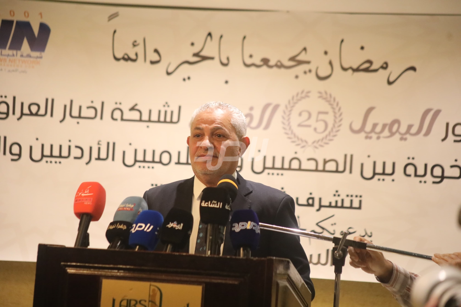 عمان - الخميس -12 آذار 2026 - في ليلة رمضانية جمعت قلوب الإعلاميين على المحبة والأخوة، رعى مندوب وزير الاتصال الحكومي الدكتور زيد النوايسة ، حفل "السحور الإعلامي" الذي أقامته شبكة أخبار العراق، مساء أمس، في قاعة فندق لارس بالعاصمة عمان. وجاءت هذه الأمسية الرمضانية الهادفة بمناسبة احتفال الشبكة بمرور ربع قرن على تأسيسها، وتحديداً اليوبيل الفضي الخامس والعشرين، في خطوة تعكس عمق العلاقات الأخوية والمهنية التي تجمع الصحفيين والإعلاميين الأردنيين بنظرائهم العراقيين.