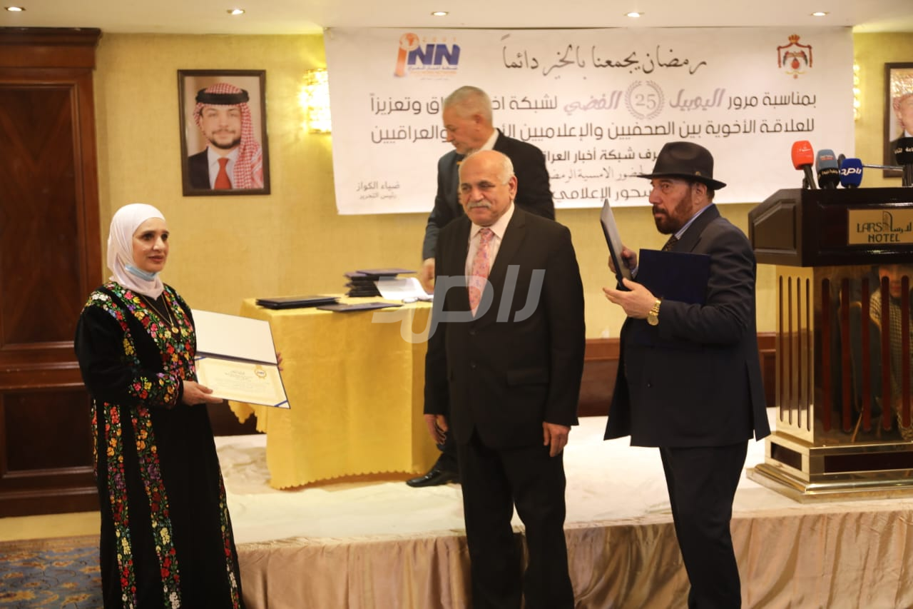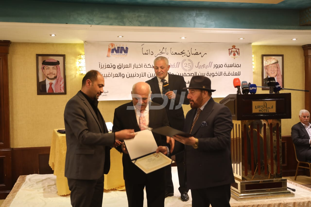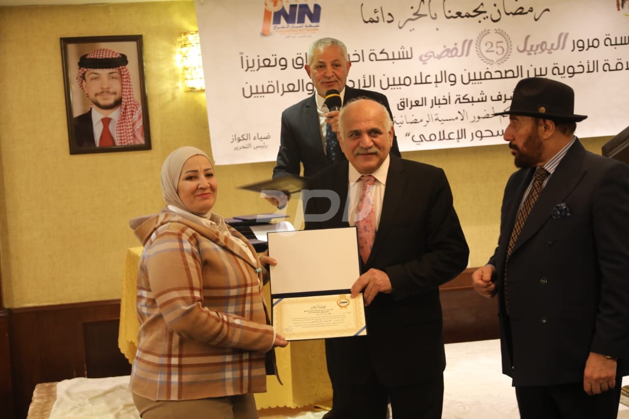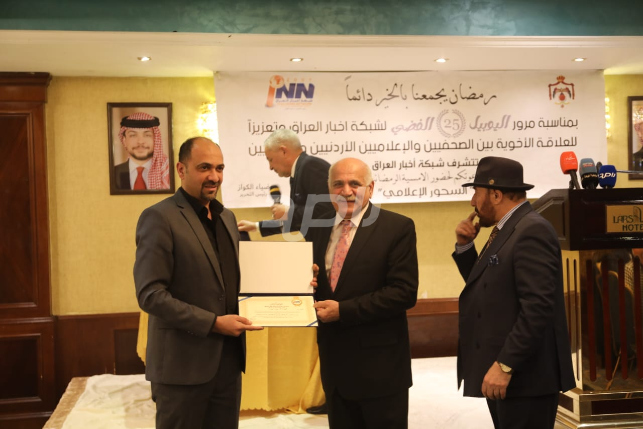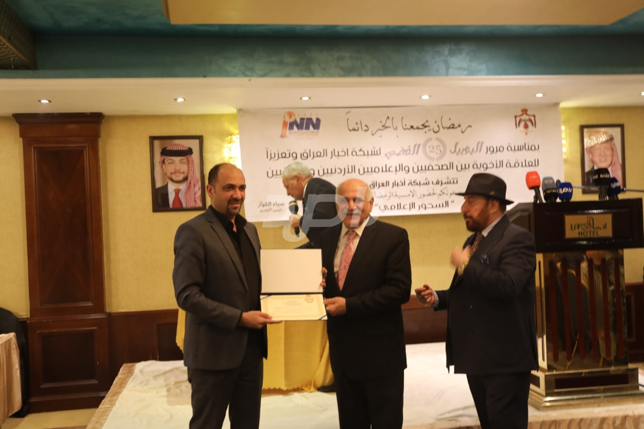ولم يخلُ الحفل من لمسات الوفاء والتقدير، حيث تضمن حفل "السحور الإعلامي" تكريماً خاصاً لمعظم وسائل الإعلام الأردنية الحاضرة، تقديراً لجهودها وتعاونها المستمر. وقام بتقديم الدروع التذكارية للمكرمين ، باسم شبكة أخبار العراق، في لفتة رمزية عكست روح التعاون والشراكة الحقيقية بين الإعلام الأردني والعراقي، وأكدت على متانة العلاقة التي تجمع الأسرة الإعلامية في البلدين الشقيقين.