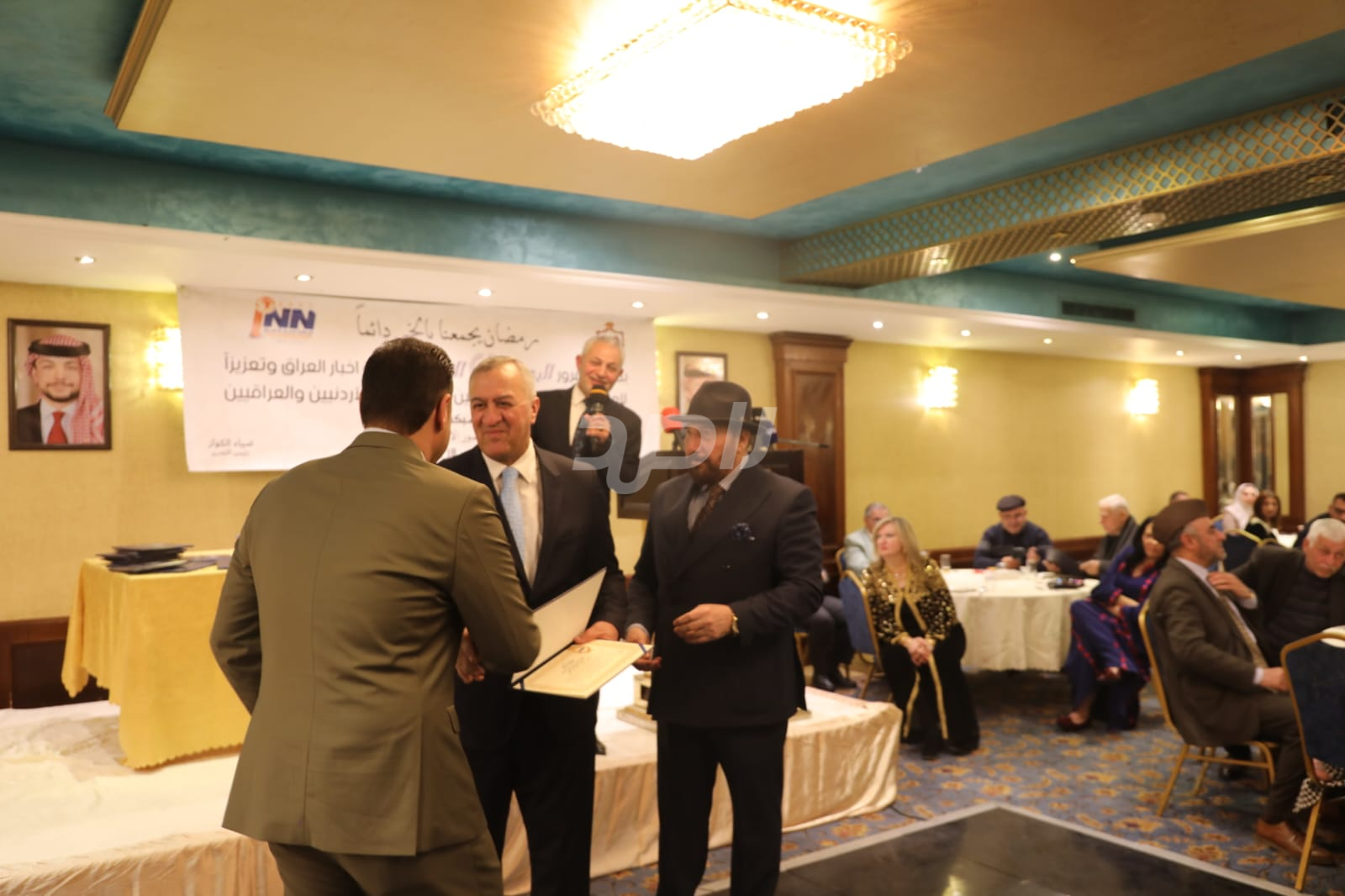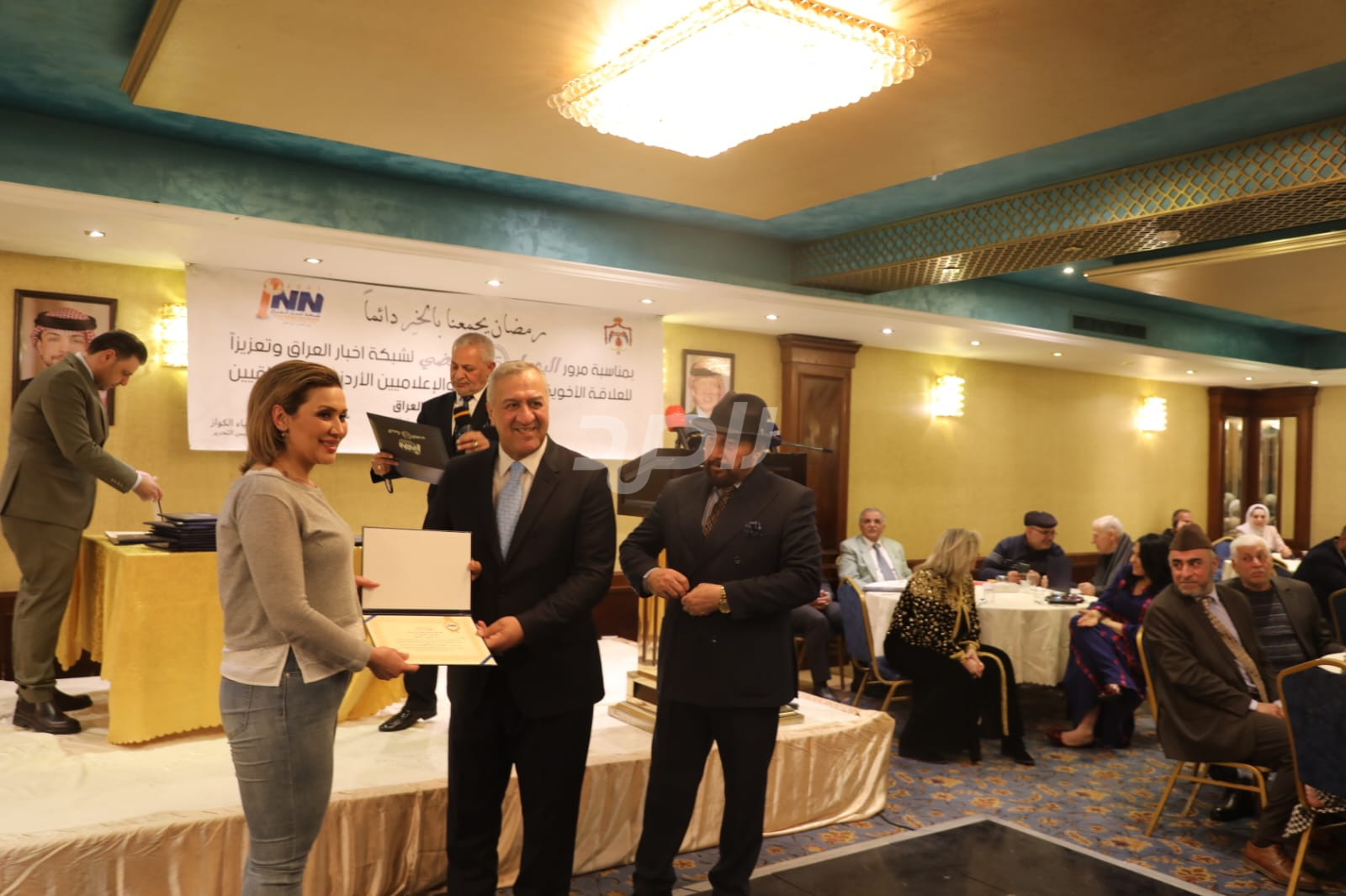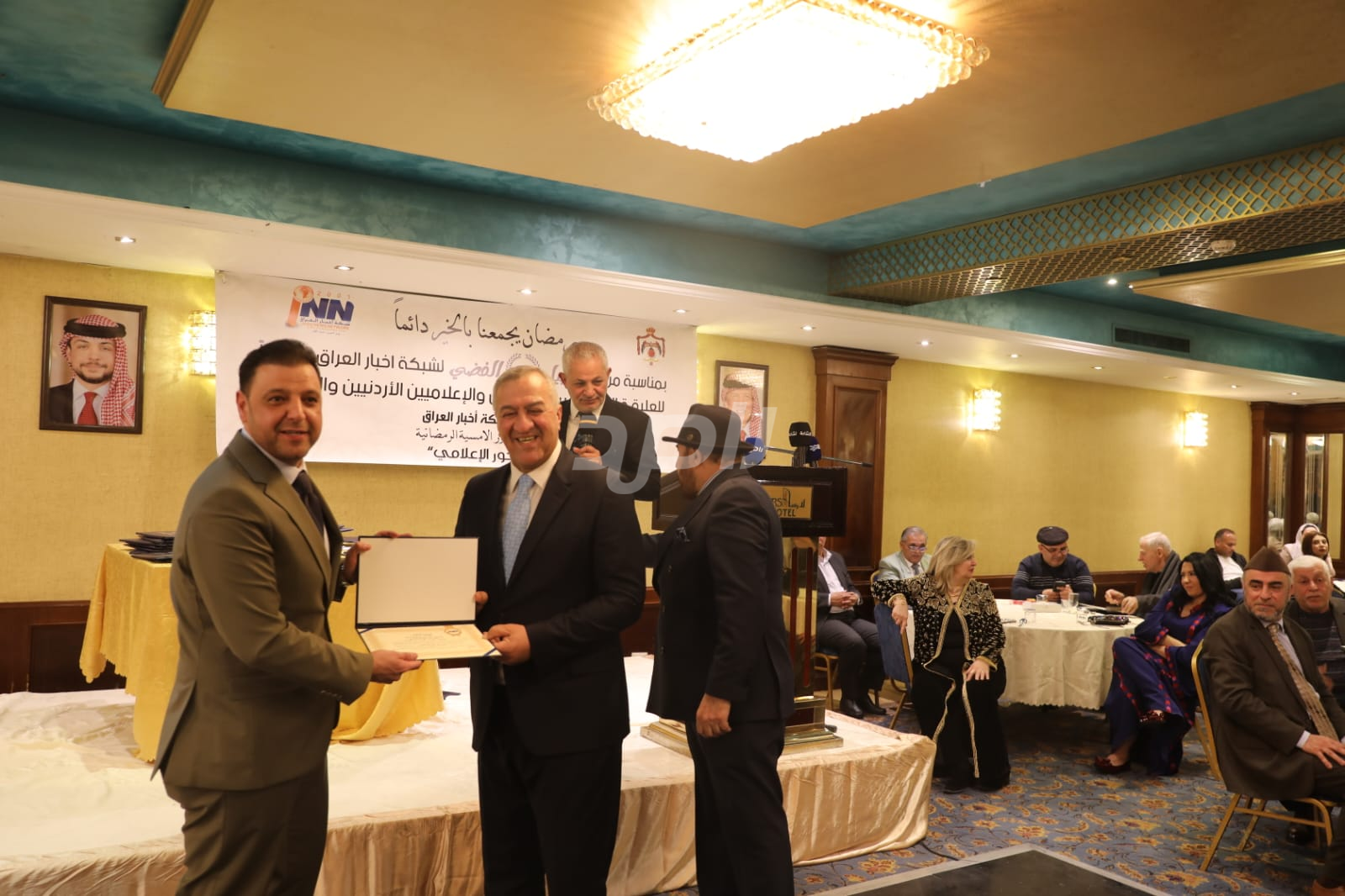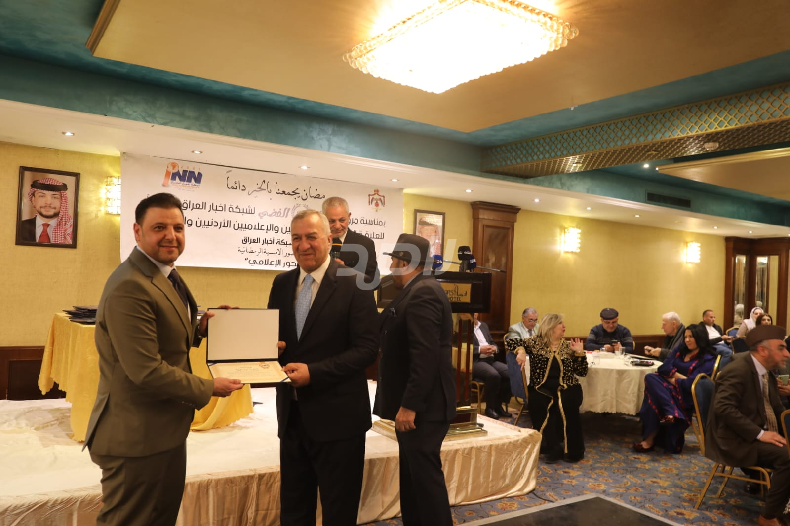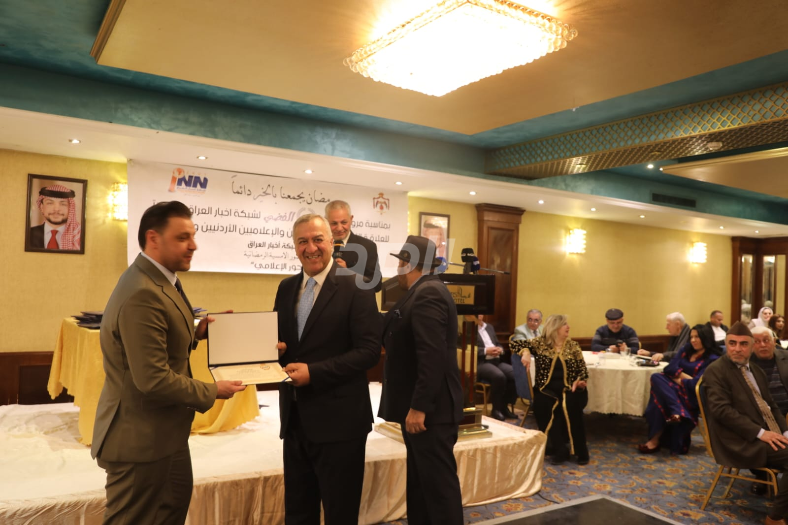 ولم يخلُ الحفل من لمسات الوفاء والتقدير، حيث تضمن حفل "السحور الإعلامي" تكريماً خاصاً لمعظم وسائل الإعلام الأردنية الحاضرة، تقديراً لجهودها وتعاونها المستمر. وقام بتقديم الدروع التذكارية للمكرمين ، باسم شبكة أخبار العراق، في لفتة رمزية عكست روح التعاون والشراكة الحقيقية بين الإعلام الأردني والعراقي، وأكدت على متانة العلاقة التي تجمع الأسرة الإعلامية في البلدين الشقيقين.