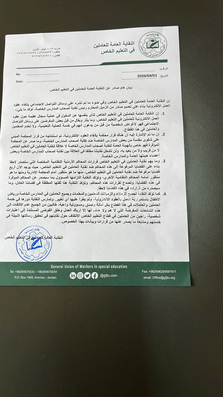 عمان – الاربعاء 1 نيسان 2026 - أصدرت النقابة العامة للعاملين في التعليم الخاص بياناً صحفياً، حصلت "راصد الاخباري" على نسخة منه، جاء حاملاً دمغة النقابة دون توقيع، وذلك في ظل الجدل المتصاعد حول عقود العمل الإلكترونية في قطاع المدارس الخاصة.