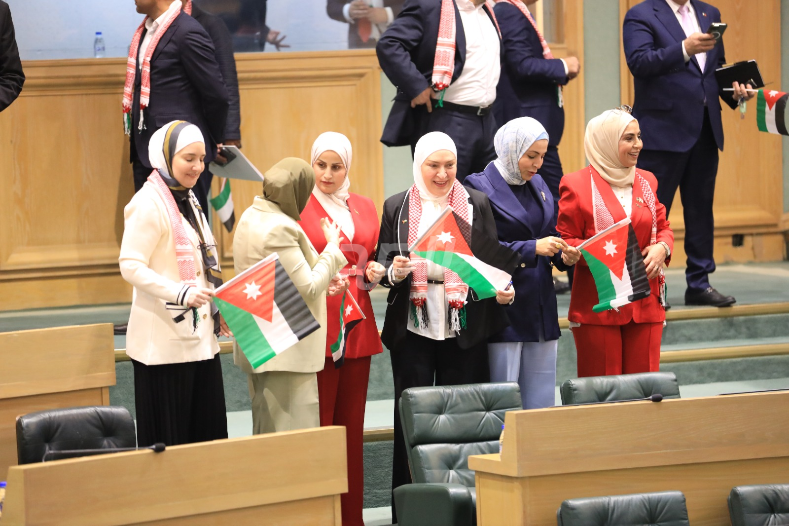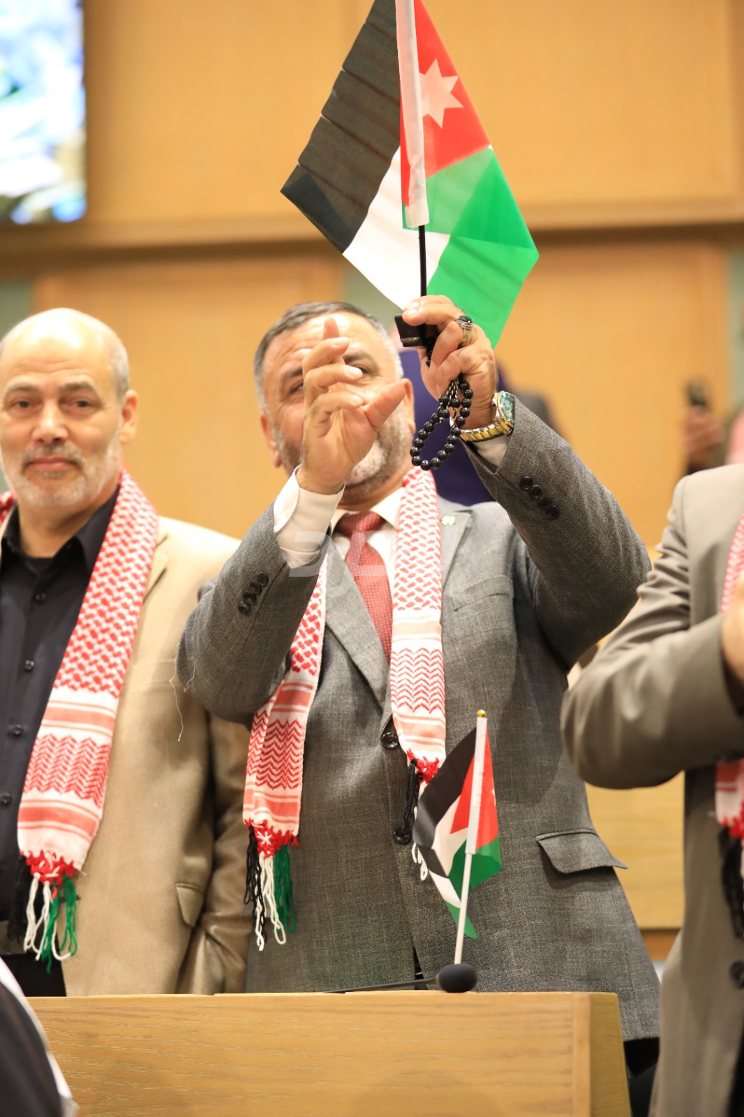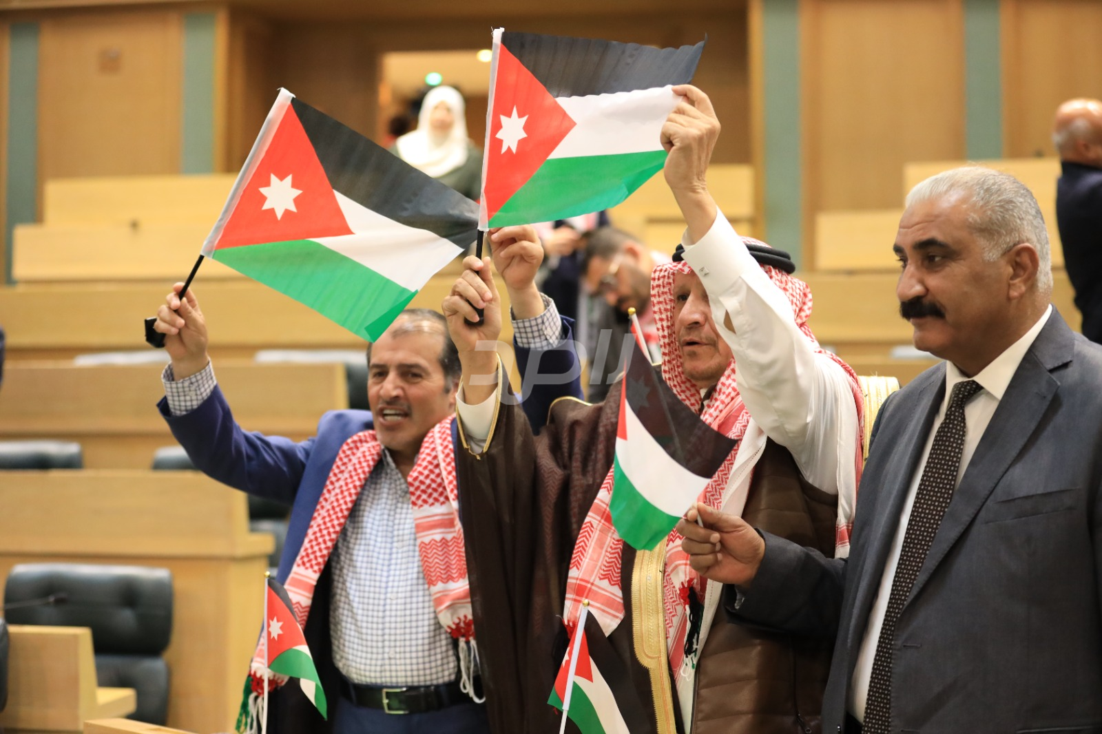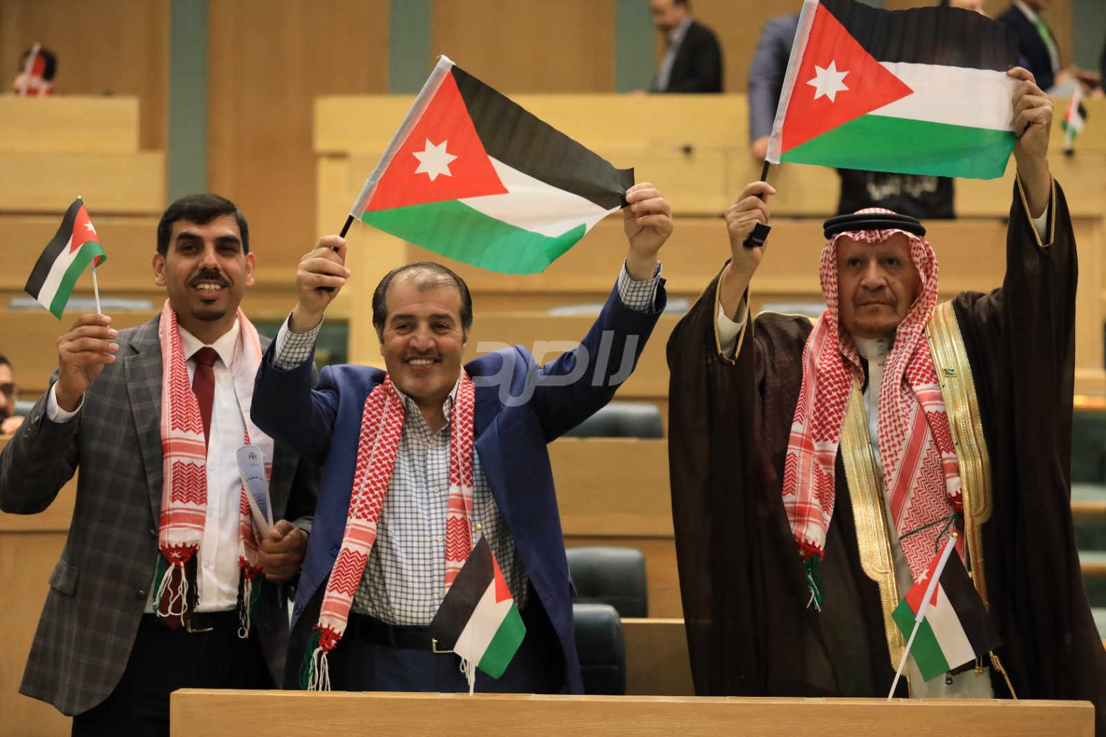 وتجلى هذا الاحتفاء من خلال ارتداء عدد من النواب الشماغ الأردني الأحمر والأبيض، الذي يُعد رمزاً تراثياً وأصالةً أردنية خالصة، بينما حمل آخرون العلم الأردني داخل قبة البرلمان، رافعين إياه عالياً في مشهد عبّر عن تلاحم النواب مع الشعب الأردني في مختلف محافظات المملكة.