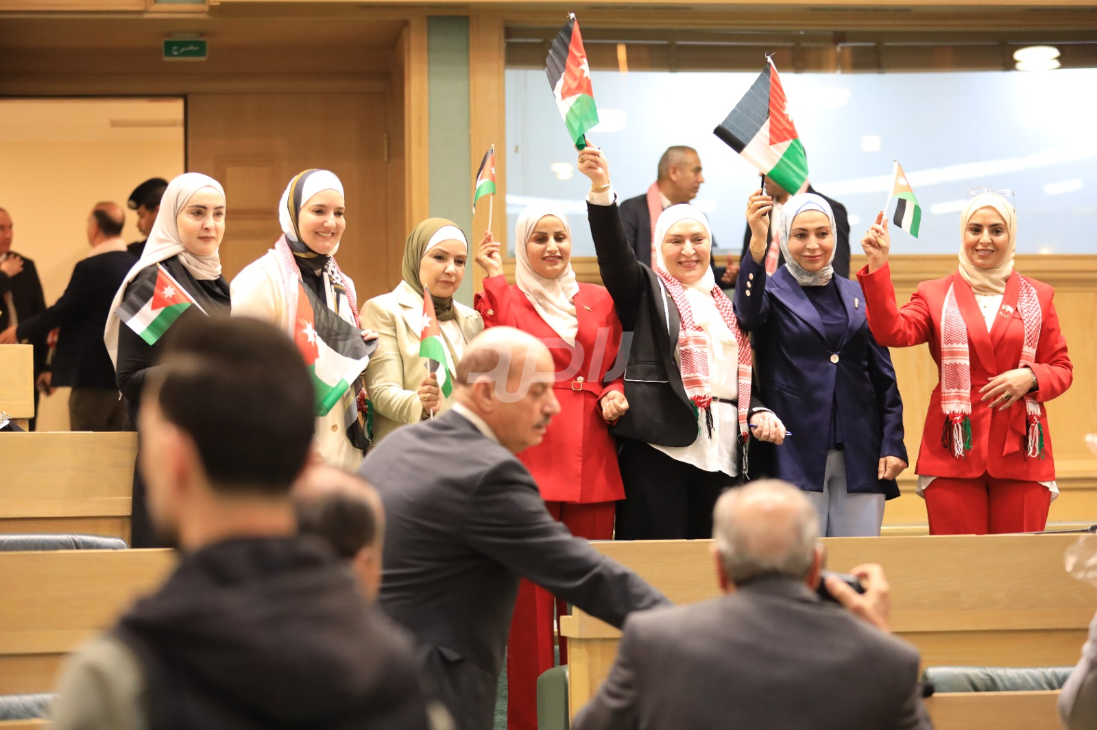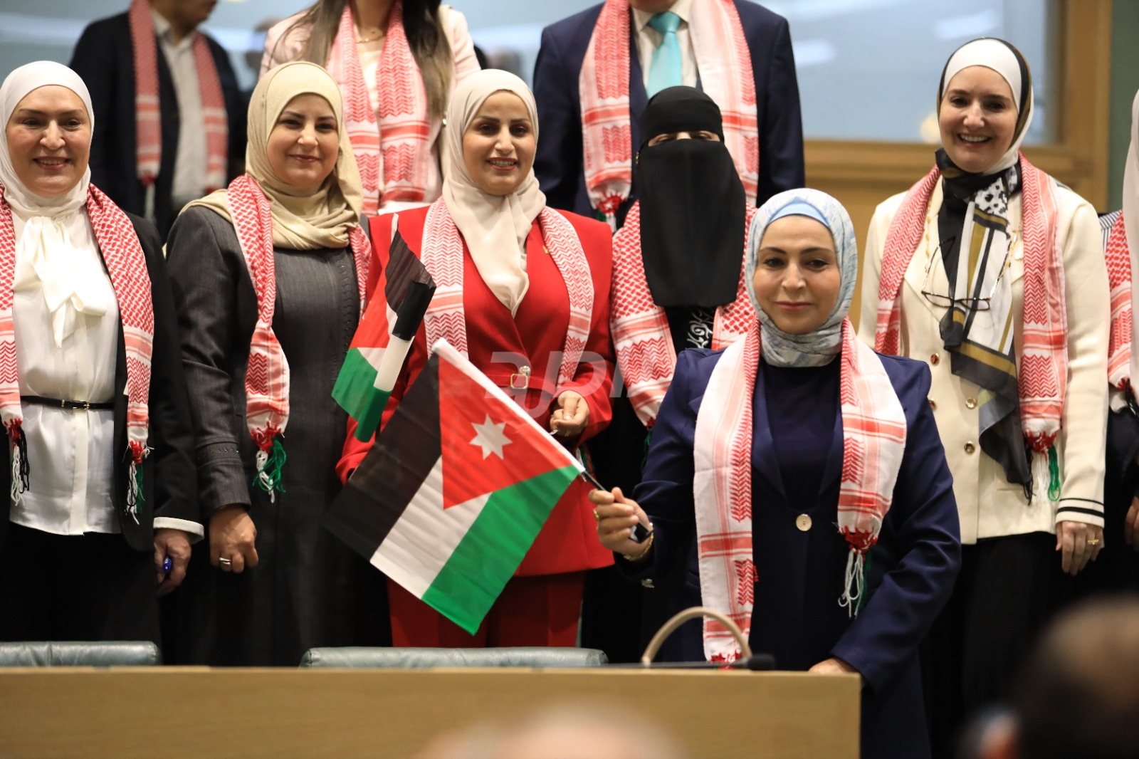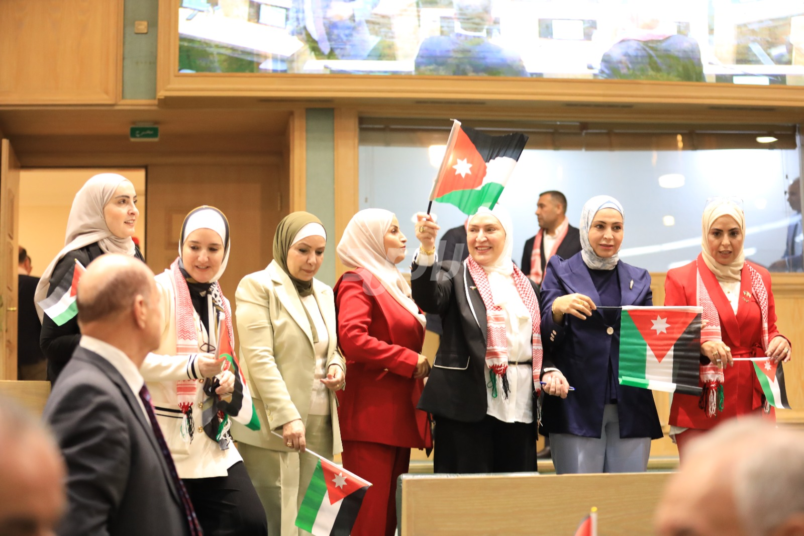 وتجلى هذا الاحتفاء من خلال ارتداء عدد من النواب الشماغ الأردني الأحمر والأبيض، الذي يُعد رمزاً تراثياً وأصالةً أردنية خالصة، بينما حمل آخرون العلم الأردني داخل قبة البرلمان، رافعين إياه عالياً في مشهد عبّر عن تلاحم النواب مع الشعب الأردني في مختلف محافظات المملكة.