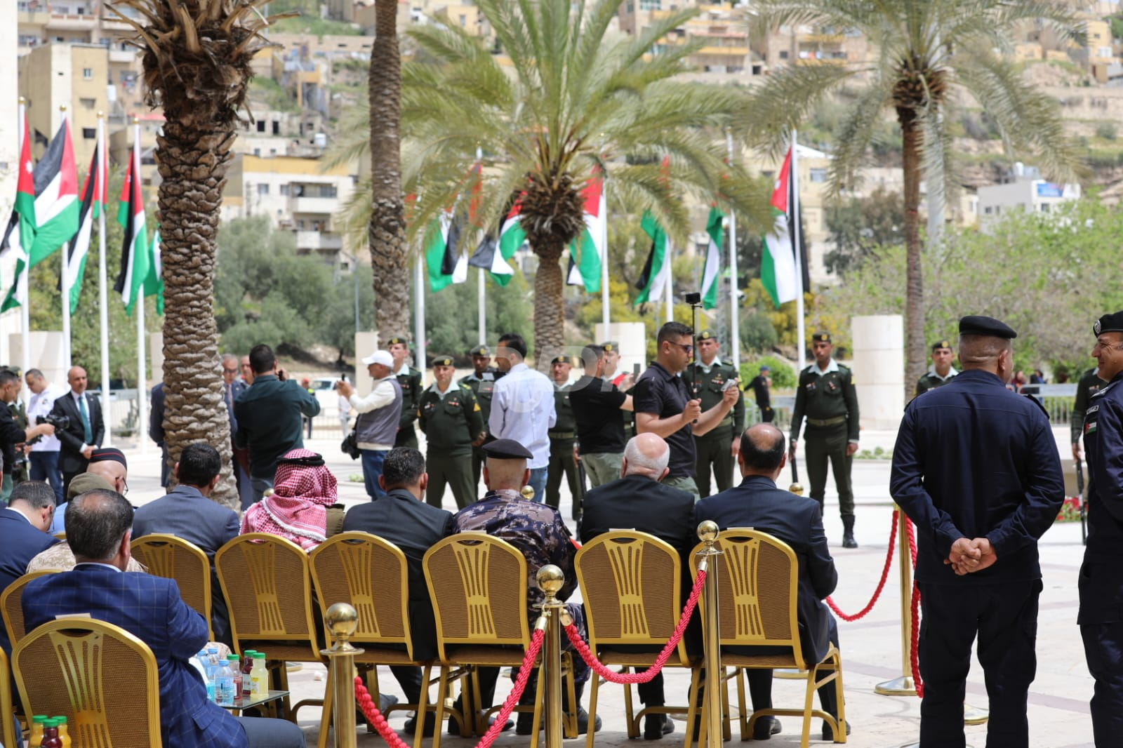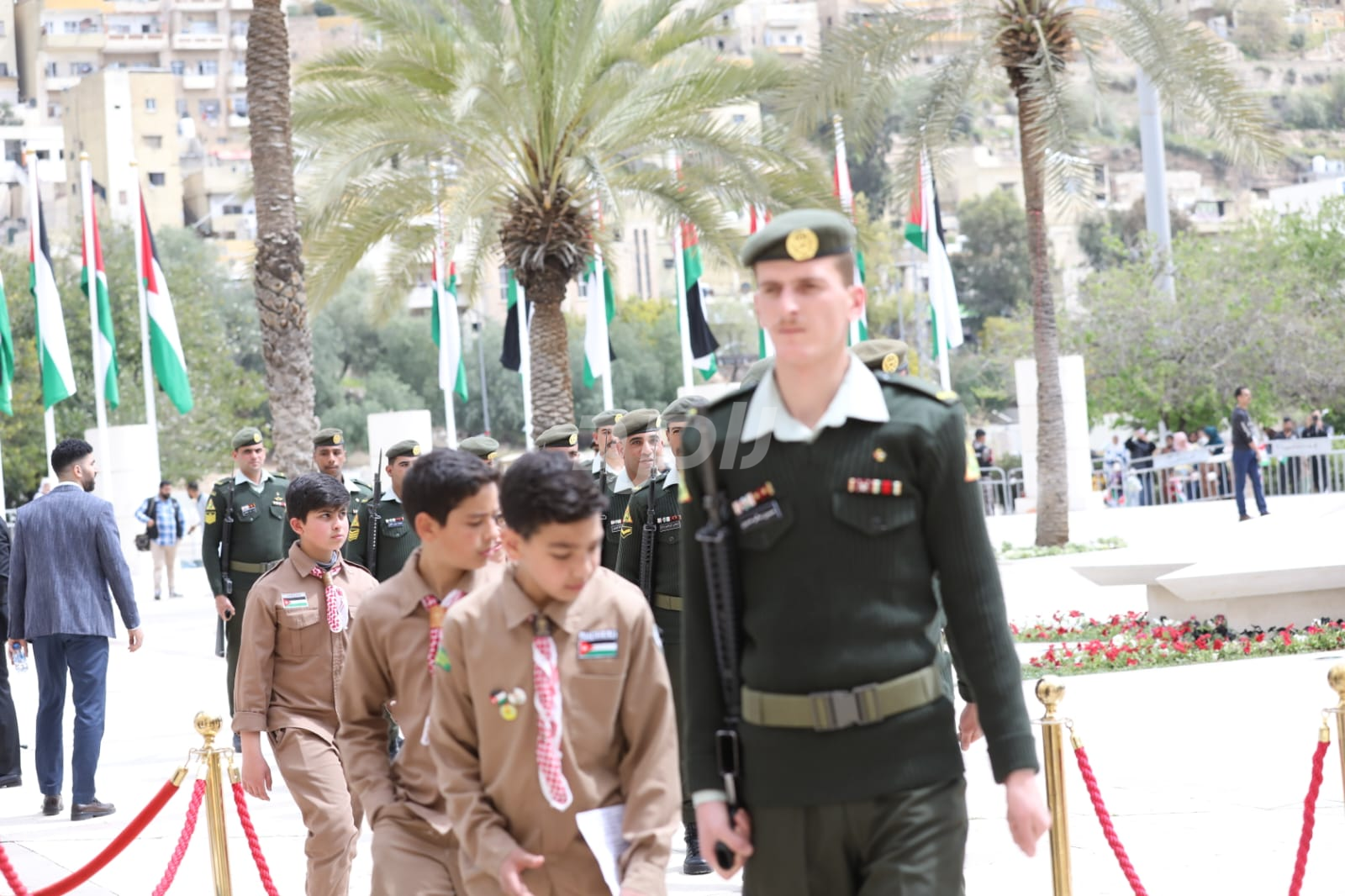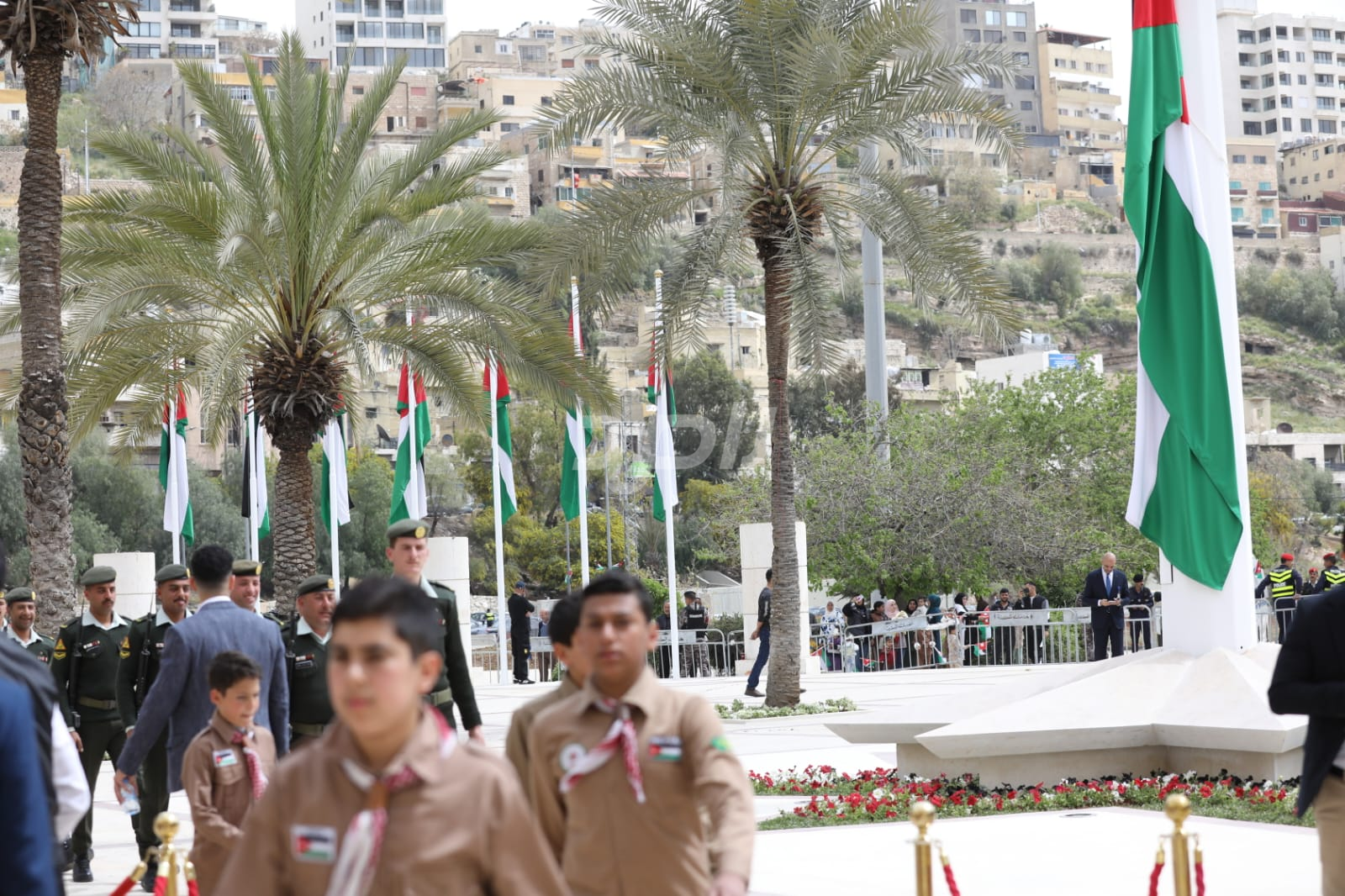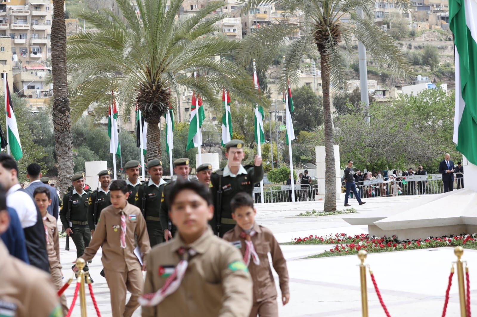 واشتمل الحفل على رفع العلم الأردني، وقدمت فرقة موسيقات القوات المسلحة والكشافة عروضاً نالت إعجاب الحاضرين.