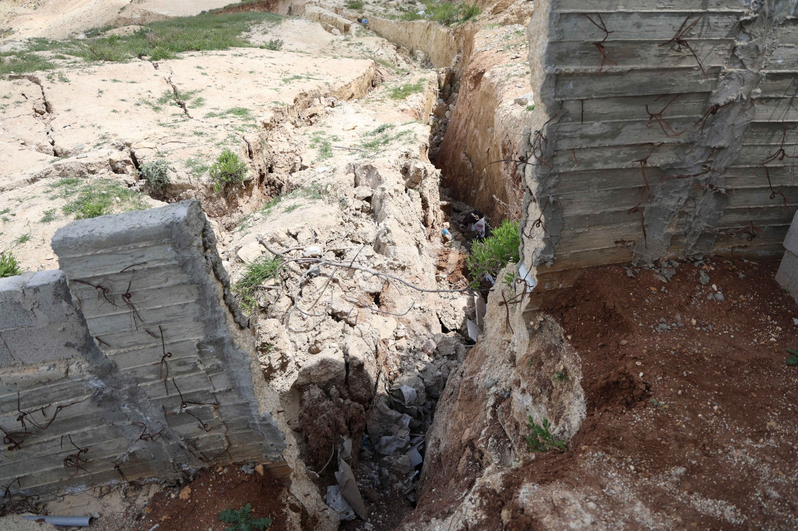 وعلى صعيد الحالة الإنشائية، أظهرت نتائج الكشف وجود أضرار جسيمة في المبنى المتضرر، تمثلت بانهيار جزئي في الجدار الاستنادي، وظهور شقوق أرضية عميقة يصل عرض بعضها إلى نحو 80 سم وعمقها إلى عدة أمتار، ما يدل على وجود حركة أرضية نشطة وخطورة عالية تهدد سلامة المبنى وسكانه.