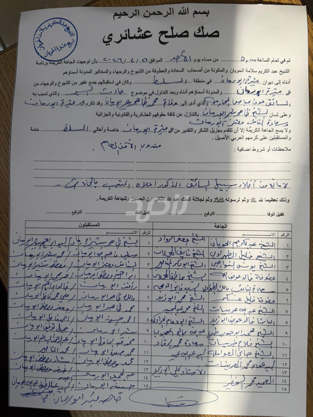 وقد أصرت الجاهة الكريمة، برئاسة الشيخ عبد الكريم الحويان، وبعد قبول الصلح وشرب القهوة، على تقديم الدية الشرعية كاملة، وضمان جميع حقوق أبناء المرحوم (أطفاله الثلاثة) وزوجته، في موقفٍ نبيل يجسّد التزام الأردنيين بالعدل إلى جانب التسامح، ويؤكد أن الصلح الحقيقي لا يكتمل إلا بردّ الحقوق وصون الكرامات وجبر الخواطر.