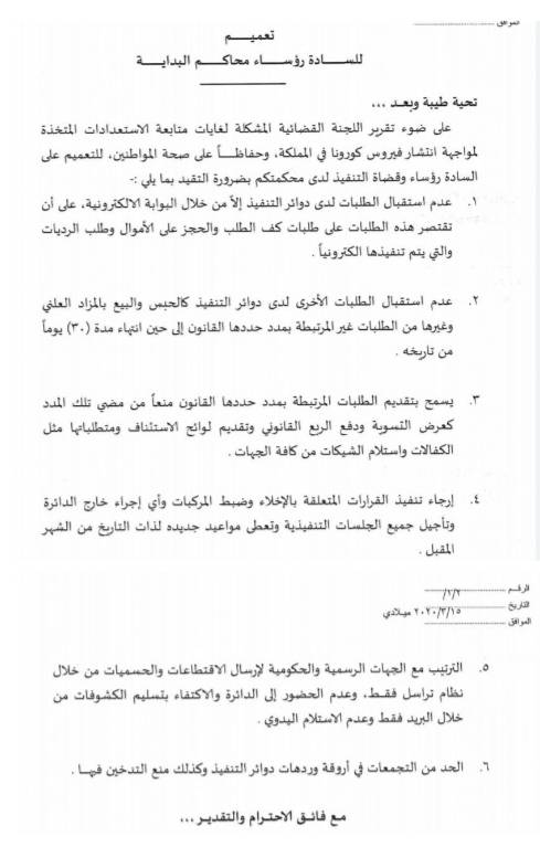 رئيس المجلس القضائي على رؤسائ محاكم البداية بعدم استقبال الطلبات لدى دوائر التنفيذ الا من خلال البوابة الالكترونية، على ان تقتصر هذه الطلبات على كف الطلب والحجز على الاموال وطلب الرديات. كما عمم بعدم استقبال الطلبات الاخرى لدى دوائر التنفيذ كالحبس والبيع بالمزاد العلني وغيرها من الطلبات غير المرتبطة بمدد حددها القانون الى حين انتهاء مدة 30 يوما. وتاليا تعميم رئيس المجلس: