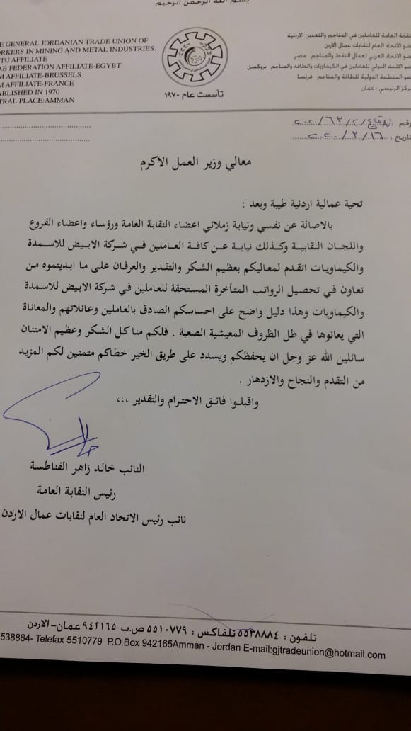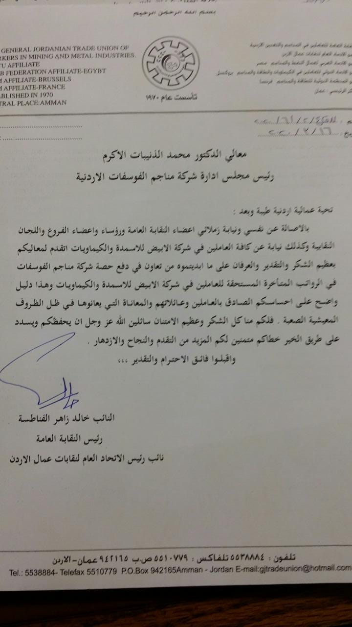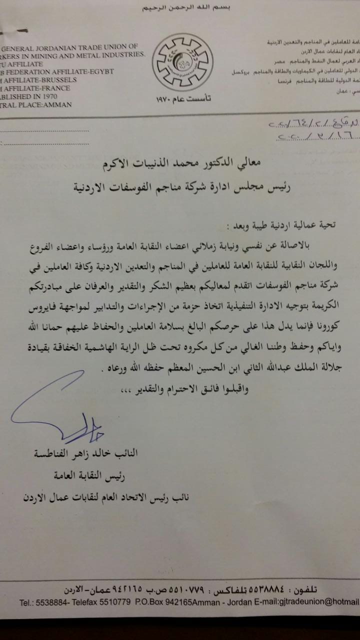 وجه رئيس النقابة العامة للعاملين في المناجم والتعدين الأردنية النائب خالد الفناطسة عبر ثلاثة كتب سطرهما، الأول لرئيس مجلس إدارة شركة مناجم الفوسفات الأردنية د. محمد الذنيبات عبر فيه عن شكره باسم العاملين على جملة القرارات التي اتخذها بخصوص دوام العاملين في الشركة احترازاً عن فايروس الكورونا إلى جانب الإجراءات التي اتخذتها الحكومة على مستوى الوطن، إضافة إلى كتاب ثاناً تضمن شكره وتقديره على قرار د. محمد الذنيبات بدفع حصة شركة مناجم الفوسفات لصالح العاملين بشركة الابيض للأسمدة من رواتب وحقوق .