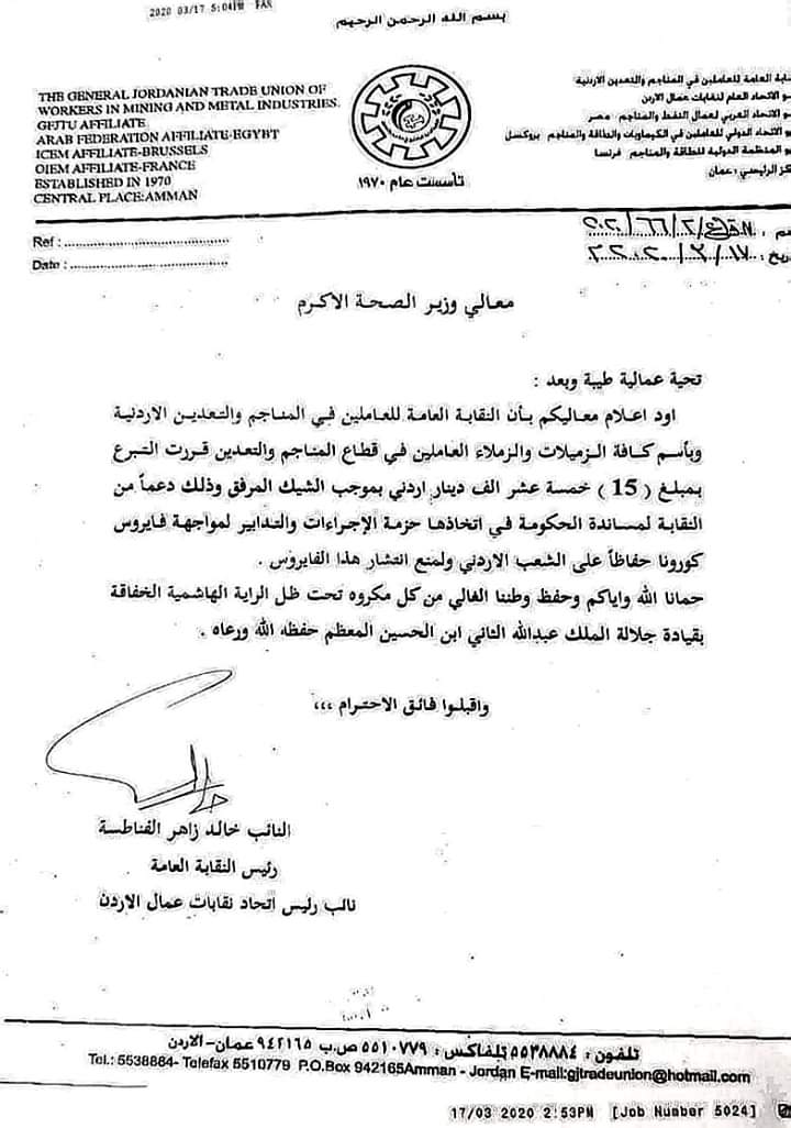 أعلن رئيس النقابة العامة للعاملين في المناجم والتعدين الأردنية النائب خالد الفناطسة بأن النقابة العامة بامكانياتها المحدودة لا تستطيع أن تقف متفرجاً بخصوص تداعيات فيروس الكورونا.