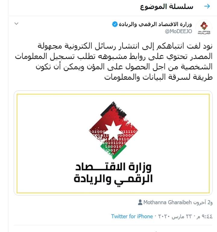 حذرت وزارة الاقتصاد الرقمي والريادة بانها تود ان تلفت انتباه المواطنين إلى انتشار رسائل الكترونية مجهولة المصدر تحتوي على روابط مشبوهه تطلب تسجيل المعلومات الشخصية من اجل الحصول على المؤن ويمكن أن تكون طريقة لسرقة البيانات والمعلومات.