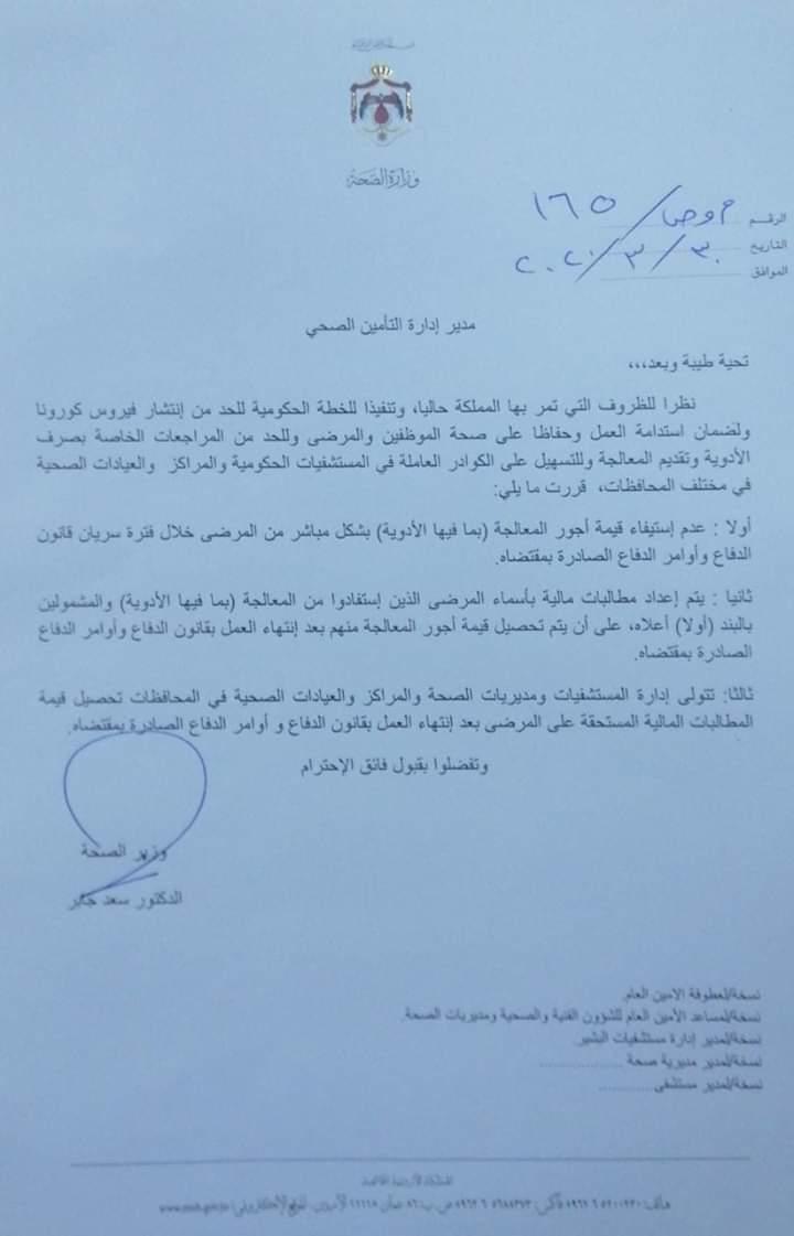 أوعز وزير الصحة الدكتور سعد جابر إلى مدير التأمين في الوزارة بعدم استيفاء قيمة أجور المعالجة بما فيها الأدوية بشكل مباشر من المرضى خلال فترة سريان قانون الدفاع وأوامر الدفع الصادرة بمقتضاه.