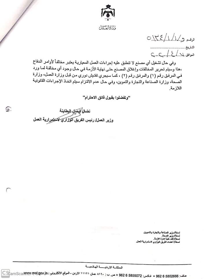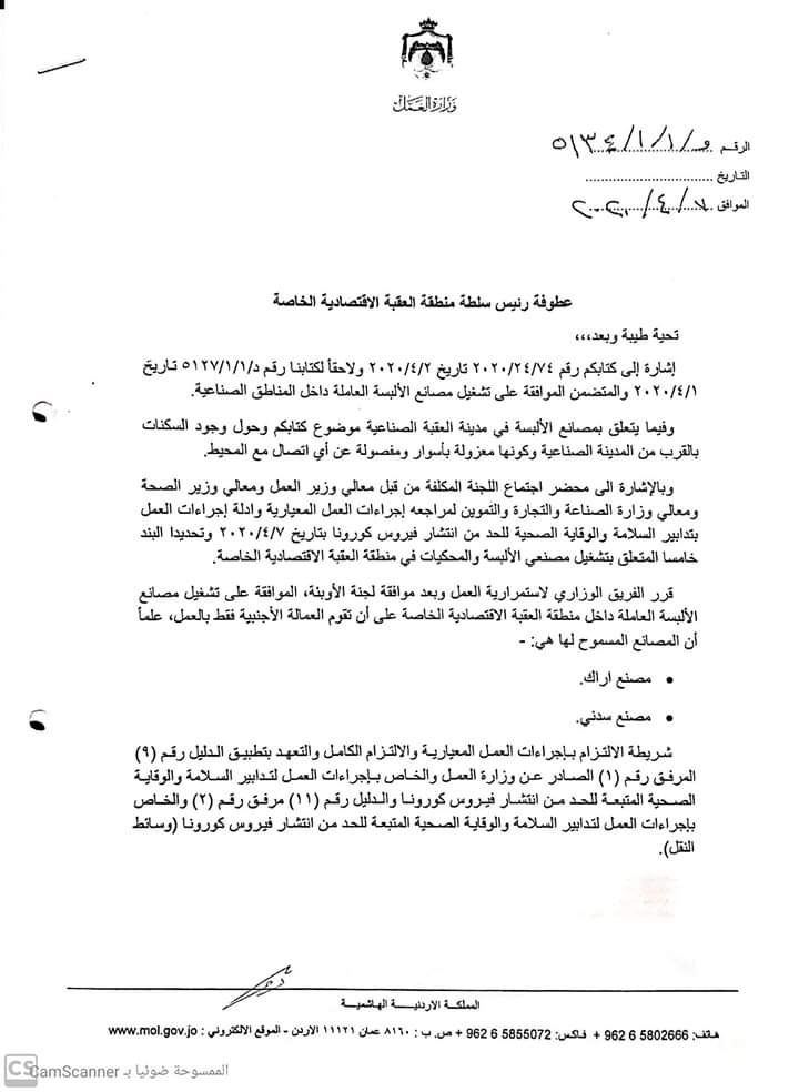 وافقت الحكومة على استئناف العمل في مصانع الألبسة في منطقة العقبة، و وجه وزير العمل نضال البطاينة رئيس الفريق الوزاري لاستمرارية العمل وبعد موافقة لجنة الاوبئة للسماح لمصانع للالبسة في منطقة العقبة الاقتصادية الخاصة شريطة الالتزام بإجراءات العمل المعيارية وادلة اجراءات العمل والسلامة العامة للوقاية من فايروس كورونا دليل رقم ٩.