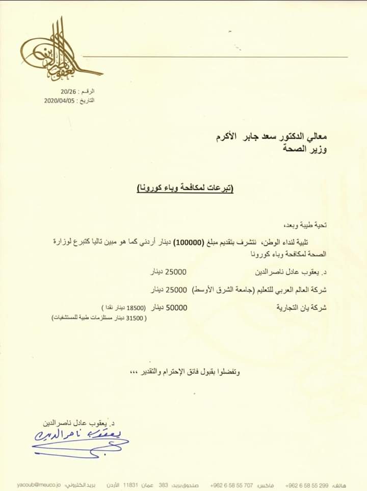 نشر رجل الأعمال د. يعقوب ناصر الدين على صفحتة على التواصل الاجتماعي صورة عن كتاب يتضمن تبرعا لوزارة الصحة بمبلغ ١٠٠ الف دينار الموزعة حسب الكتاب ثم اتبعه بالتعليق التالي