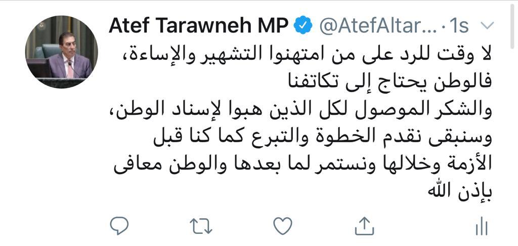 وكتب الطراونة تغريدة على تويتر جاء فيها: لا وقت للرد على من امتهنوا التشهير والإساءة، فالوطن يحتاج إلى تكاتفنا. والشكر الموصول لكل الذين هبوا لإسناد الوطن، وسنبقى نقدم الخطوة والتبرع كما كنا قبل الأزمة وخلالها ونستمر لما بعدها والوطن معافى بإذن الله.