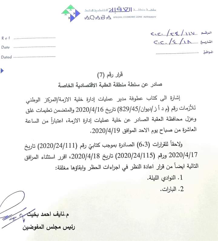 قرار رقم ( 7) استمرار إغلاق المنشات والمرافق التالية في منطقة العقبة الاقتصادية الخاصة