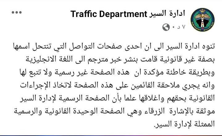تنوه ادارة السير المركزية التابعة لمديرية الأمن العام الى ان احدى صفحات التواصل التي تنتحل اسمها بصفة غير قانونية قامت بنشر خبر مترجم الى اللغة الانجليزية وبطريقة خاطئة مؤكدة ان هذه الصفحة غير رسمية ولا تتبع لها وانه يجري ملاحقة القائمين على هذه الصفحة لاتخاذ الإجراءات القانونية بحقهم واغلاقها علما بأن الصفحة الرسمية لإدارة السير موثقة بالإشارة الزرقاء وهي الصفحة الوحيدة القانونية والرسمية الممثلة لإدارة السير.