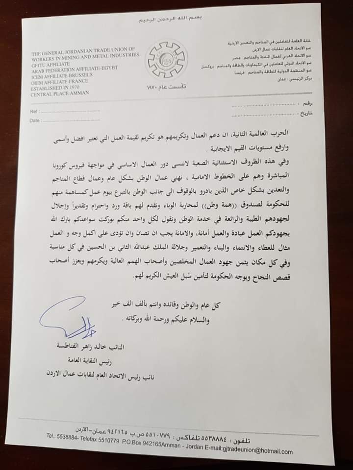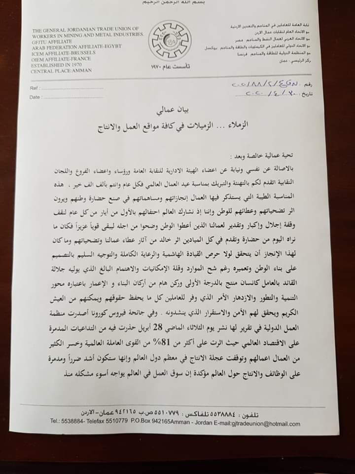 وجهت النقابة العامة للعاملين في المناجم والتعدين الأردنية تهنئة بعيد العمال الذي يصادف غدا .