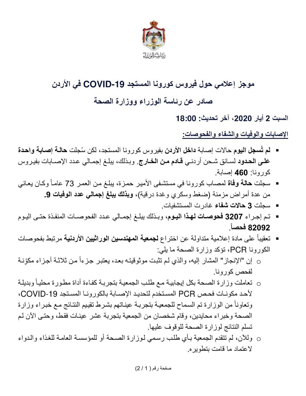 وزير الصحة د. سعد جابر : لا إصابات بفيروس كرونا داخل المملكة وإصابة واحدة لسائق شاحنة على الحدود وتسجيل 3 حالات شفاء .