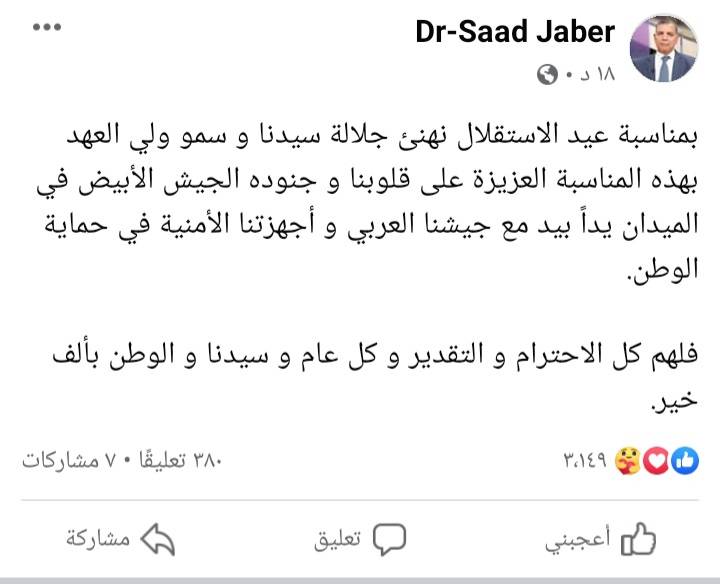 بمناسبة عيد الاستقلال نهنئ جلالة سيدنا و سمو ولي العهد بهذه المناسبة العزيزة على قلوبنا و جنوده الجيش الأبيض في الميدان يداً بيد مع جيشنا العربي و أجهزتنا الأمنية في حماية الوطن.